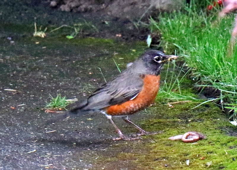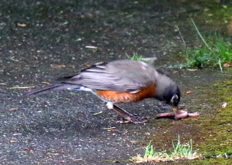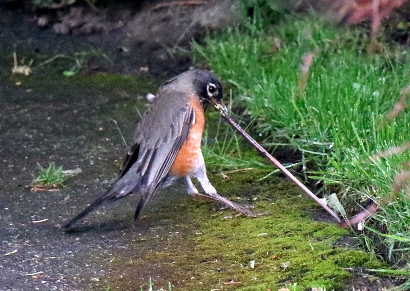 I took my big camera with the zoom lens tonight with me on my neighborhood walk, and was rewarded with catching this American robin (Turdus migratorius), catching an earthworm. The bird saw the worm wriggle into the grass sod, and ran up and pulled it out.