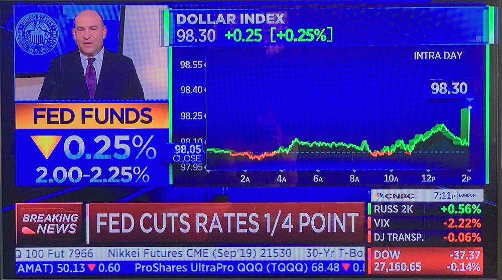 Federal Reserve Chairman Jay Powell fielded a lot of questions today after the announcement that the Federal funds rate will be cut by 25 basis points to a target rate of 2.00 – 2.25%. He characterized the cut as a mid-cycle ‘adjustment of policy’ — and that it is a way to brace against downside risks. (Um, another way to ‘brace against downside risks’ would be for the Trump Administration to stop the never-ending tariff wars with China and others).