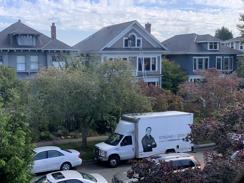 The house that I have ‘under surveillance’. It has been pressure washed outside, and a contractor is cleaning the windows. There’s the staging truck in front of it (picture from Tuesday). The house was built in 1902, and its online history says it was last sold in July of 1999: 20 years ago. The Seattle housing market is still very competitive, but much more balanced between buyers and sellers compared to just a year ago.