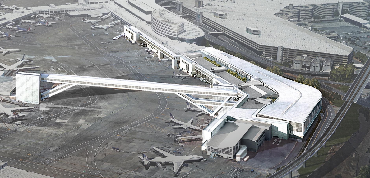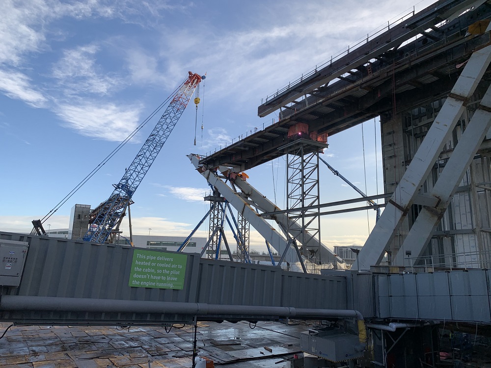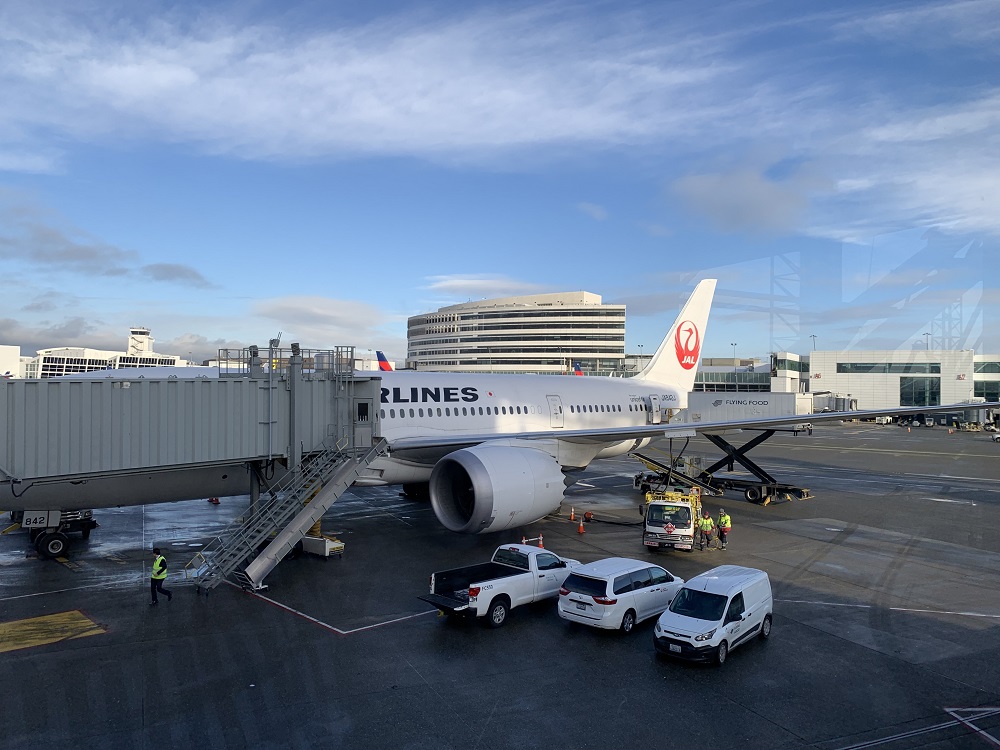 Here’s my Japan Airlines Boeing 787-8 Dreamliner that will fly to Tokyo. I went into ‘aviation geek’ mode and looked up the details for the air frame registration code on the tail (JA842J). The air frame is 4.6 yrs old, and was produced in Everett right here in Washington State.Here is the sky bridge that is under construction, as seen here from the South Terminal. The span of the bridge is 900 ft, and it sits 85 ft above the active taxiway below. The construction is a little bit behind schedule; it was supposed to open late this year. The sky bridge is part of improvements for the International Arrivals Facility.Here is an artist’s rendering of the completed sky bridge. Arriving passengers at South Satellite terminal (the planes parked on the left) will go across the bridge and over Concourse A (bottom right) to customs, inside the IAF (on the far right). The bridge is 900 ft long, and 85 ft above the active taxiway below.