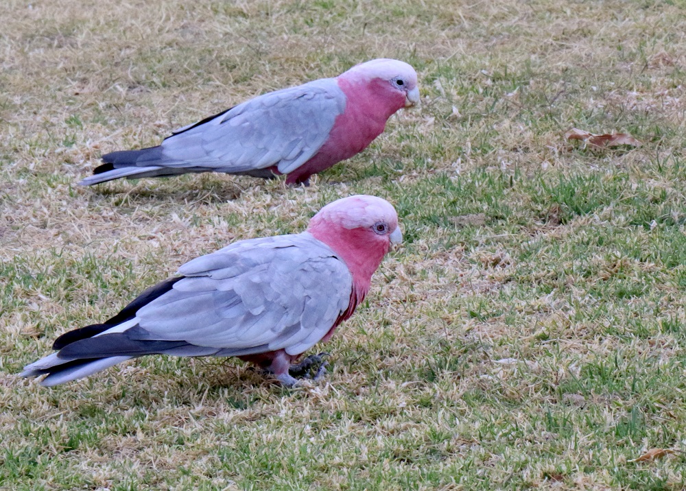 The galah /ɡəˈlɑː/ (Eolophus roseicapilla), also known as the pink-and-grey, is one of the most common and widespread cockatoos in Australia, found in all the states. These two were part of a group of six that were foraging on a lawn in Shelley Beach Park.