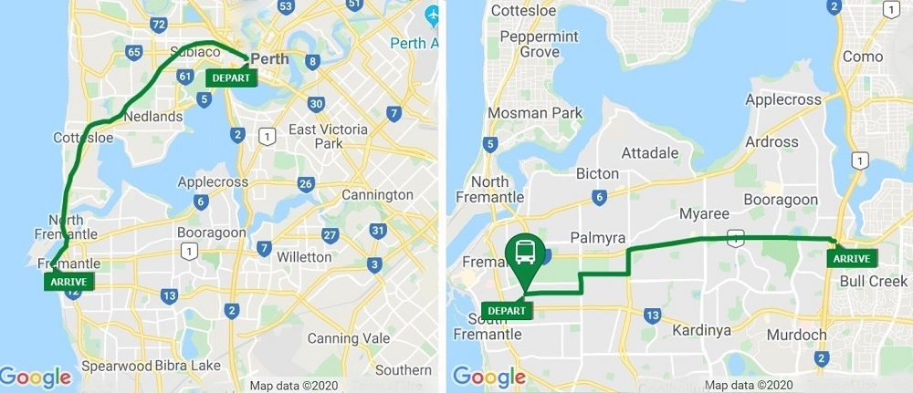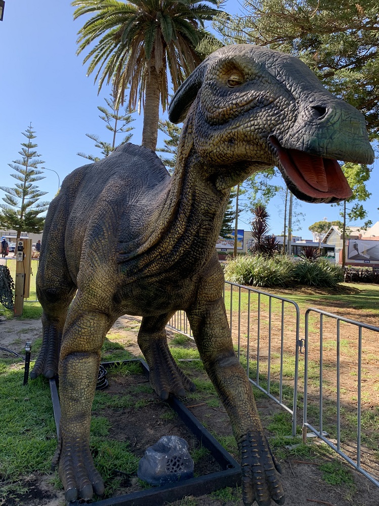 Left: The train route from Perth station to Fremont station (about 30 mins). Right: The No 501 bus route from Fremont station to Bull Creek station (about 30 mins).Here is Perth station. The Fremantle southbound line runs from on Platform 7. This one is above ground, and should not to be confused with Perth Underground station.I arrived at Fremantle station at 4.00 pm on the nose. Note the white swan ornaments on the roof line. This station building was constructed in 1907, near the site of the original Fremantle station that was established in 1881.I am sure the stories that the Federal Hotel at 23 William St in Fremantle can tell, are many and legendary. (Among others, it has seen a double murder upstairs). The hotel opened in July 1887, and has been renovated several times since then.This cute dinosaur near the Fremantle station in a park, makes noises and opens and closes its eyes. It is a Parasaurolophus, and roamed around in Canada some 70 million years ago.Here is the Fremantle town hall building and its tower. It opened in 1887. The crane behind it is located on King’s Square.The Kings Square Renewal Project aims to revitalize the centre of Fremantle’s civic and commercial heart. Western Australia is doing well with the upswing in the commodities industry (record prices were paid for iron ore exported from the state in 2019, for example).The colorful courtyard of an old shopping center called. Westgate Mall. I guess that’s graffiti on the walls, but I like the pattern painted on the paving.Fremantle has a number of these gorgeous old ficus trees (at least that’s what I think they are).This old brick building is near the railway line, and the port of Fremantle. Back in its heyday i twas used to store bales of wool from the interior of the country, for export.Here is the train from Perth, running south towards Fremantle station.