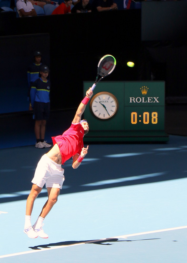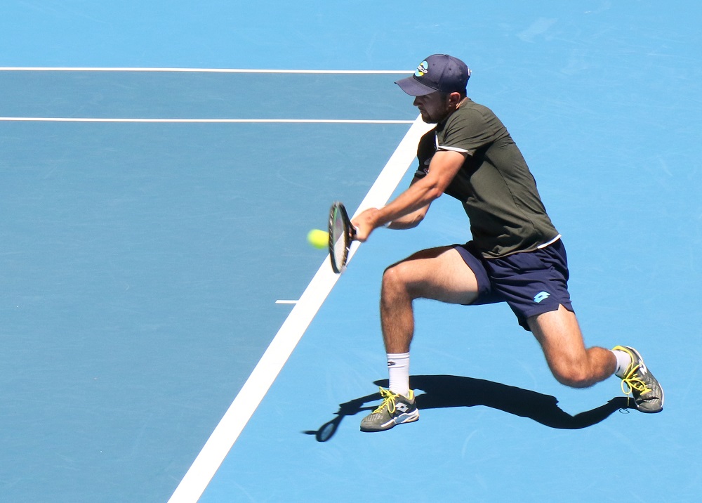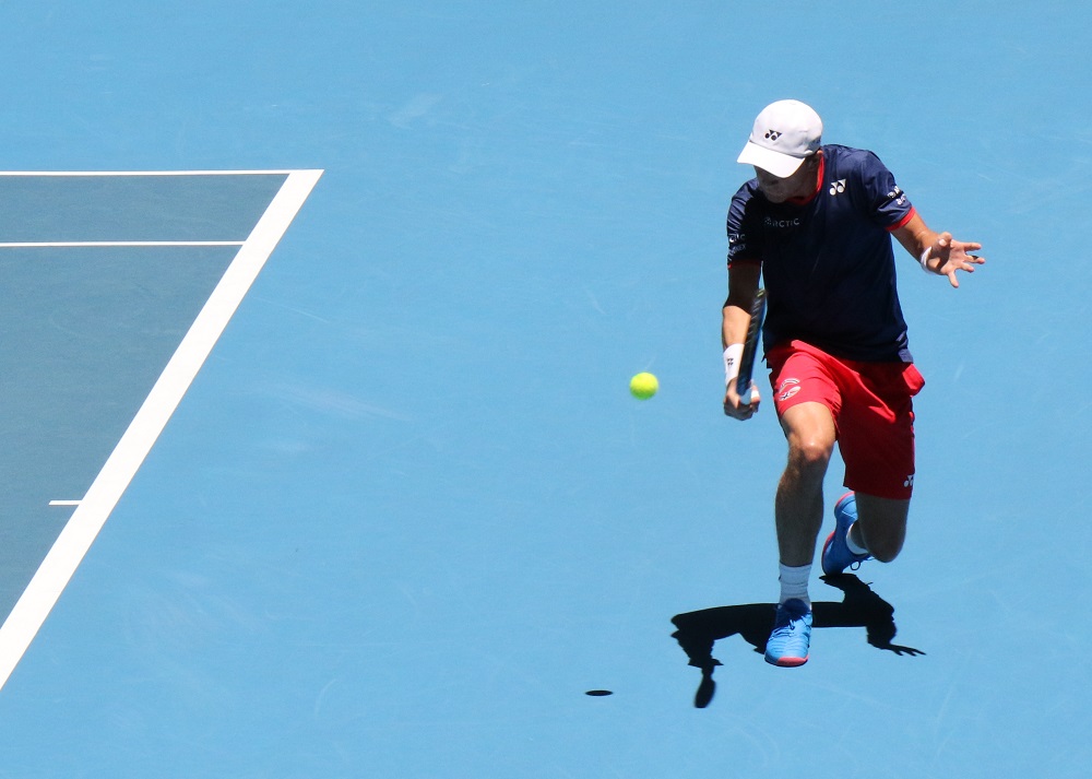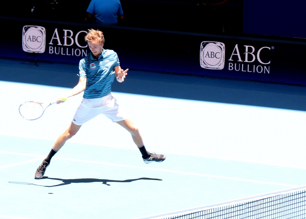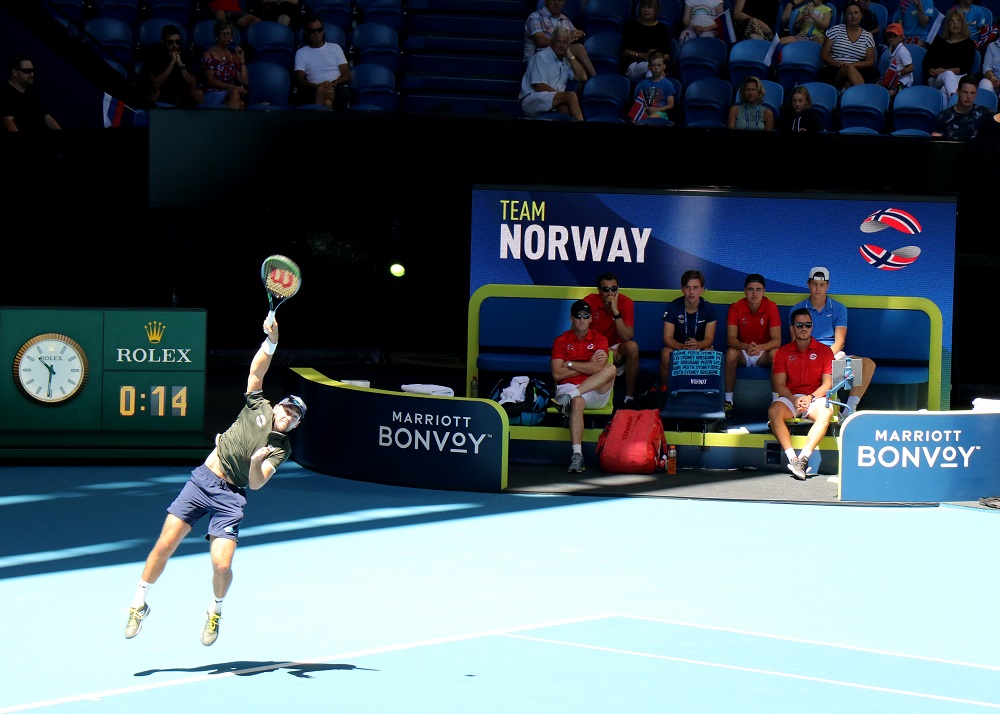 The sparse crowd inside of Perth’s RAC Arena (constructed in 2012). We watched the two singles matches (there is also one doubles match) in the Russia vs. Norway match-up in Group D. This is the little opening ceremony with Norway’s flag on the left and Russia’s on the right. We all stood while they played the national anthems. Let me just note: Russia has one of the world’s great national anthems (composer Alexander Alexandrov; Stalin commissioned him and lyrist Sergey Mikhalkovto create a national anthem and it was adopted in 1944).This is the Russia team’s No 2 player, 23-year old Karen Khachanov, 1.98 m (6 ft 6 in) tall. He was born in Moscow, and is of Armenian descent.Here is Viktor Durasovic, Norway’s No 2, serving against Khachanov as his team mates and captain look on. In team tennis, the team mates and coaches can offer advice and support from the court side .. which is not allowed on the ATP professional tennis circuit tournaments.The Durasovic double-handed backhand. Good form, meeting the ball down low and in front, but not good enough for a win against Khachanov. He lost 1-6, 2-6.The next singles match between the No 1’s on the teams, had Russia’s Daniil Medvedev take on Norway’s Casper Ruud. Here he is hitting a powerful forehand on a short ball. Medvedev had compiled a very good record in 2019, pushing him up all the way to No 5 in the ATP world rankings.And here is Norway’s Casper Ruud, playing against Medvedev. The match was fairly close: Ruud losing 3-6, 6-7 (6-8), in the end. By then Norway was down 0-2 matches, and Russia had effectively won the tie.