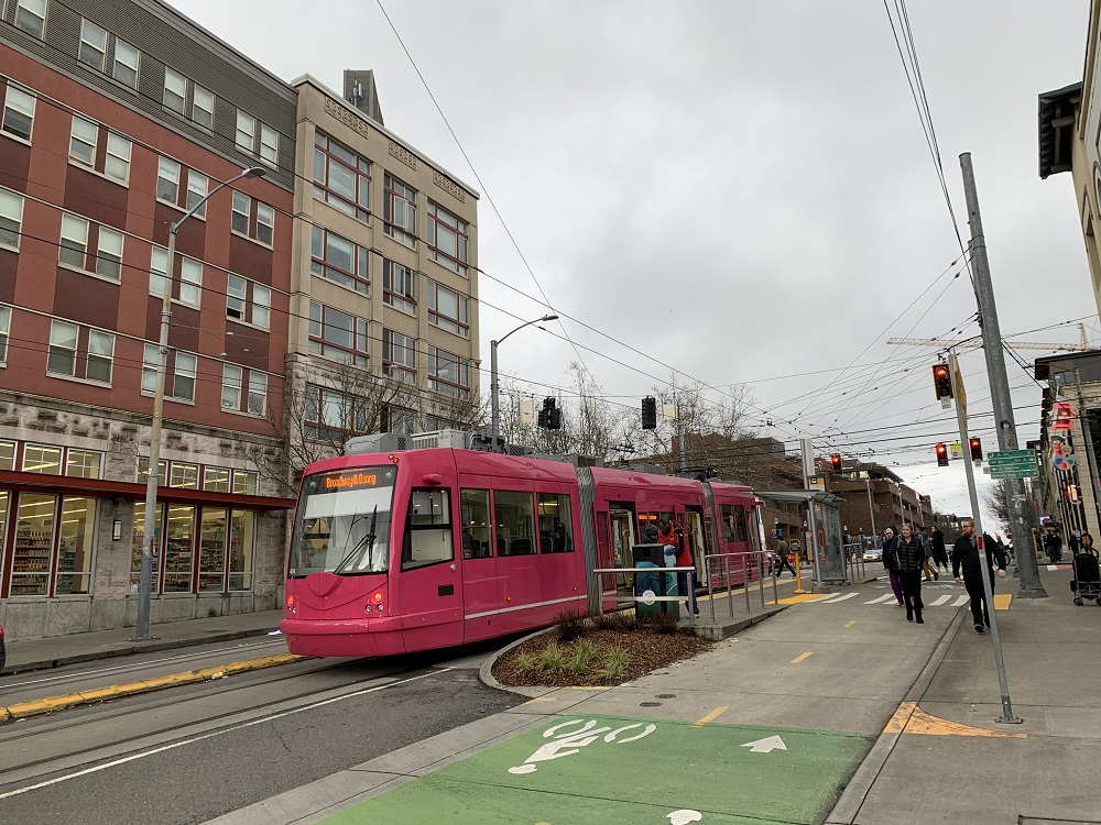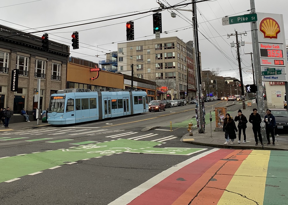 Thank heavens for the rainbow crosswalks, and the blue and pink street cars, I thought, as I walked along Broadway today. They bring some color — to counter the gray skies and sidewalks.