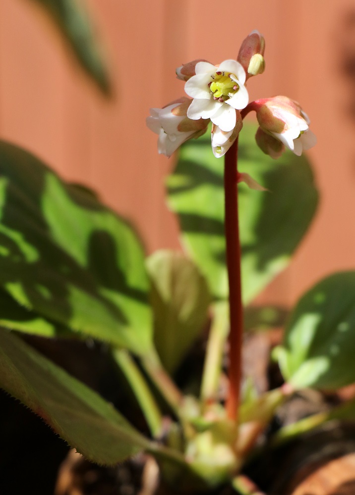 Posted on April 1, 2020April 2, 2020 by WillemWednesday/ here’s April The little bergenia ‘Bressingham White’ that I have in a pot, has produced its first flowers. Bergenias have leathery, shiny, rounded leaves that get a bronze tinge in winter time. The little flowers are bell-shaped.
