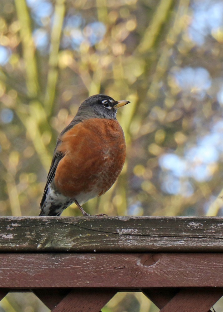 Posted on April 18, 2020April 22, 2020 by WillemSaturday/ a little rain There was a little rain this morning — just a sprinkle. This afternoon Mr Robin came by (American robin, Turdus migratorius). He sat still on the fence for just long enough so that I could snap him.