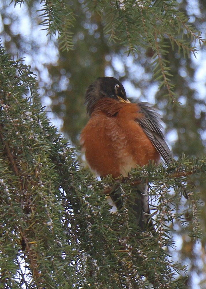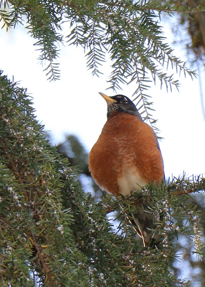More robin pictures. I took these on Sunday, and the tree is the Douglas fir in my backyard.