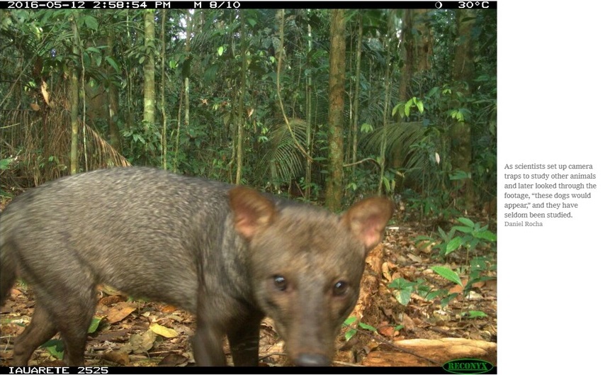 A haunting still image of one of the Amazon rain forest’s most elusive and enigmatic mammals. It’s a short-eared dog .. or at least a type of dog. It is the only member of the canine genus Atelocynus, and also called the short-eared zorro (Atelocynus microtis). Researchers only learned of the species when it made cameo appearances on camera traps deep in the forest, that had been set up for other animals. At present, some 50 researchers are unraveling the creature’s habits and characteristics, hoping to be able to better protect it from extinction. [Video Still by Daniel Rocha. Information from the Science section in the New York Times, May 4, 2020].