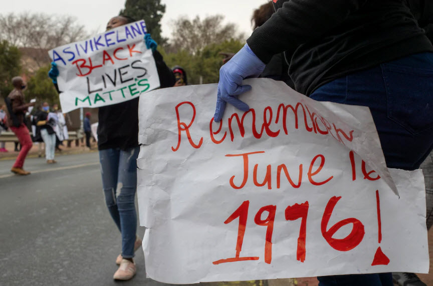 Young South Africans, wearing face masks and keeping a distance, mark the country’s Youth Day holiday in Soweto, South Africa, Tuesday, June 16, 2020. Nearly 200 young South Africans, wearing face masks and keeping a distance, marked the country’s Youth Day holiday, the 44th anniversary of the 1976 Soweto students’ uprising which helped to bring about the end of the country’s previous regime of racist, minority rule. Äsivikelane is Zulu for “Protect each other’. [Themba Hadebe/Associated Press]June 16, 1976, is a day that saw fierce police brutality in South Africa. Several thousand high school students in Johannesburg’s poor township of Soweto demonstrated against the minority South African government. (In 1974, a decree had been issued that had forced all township schools to use Afrikaans and English in a 50–50 mix as languages of instruction).