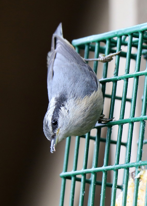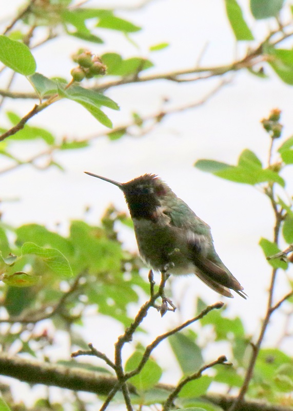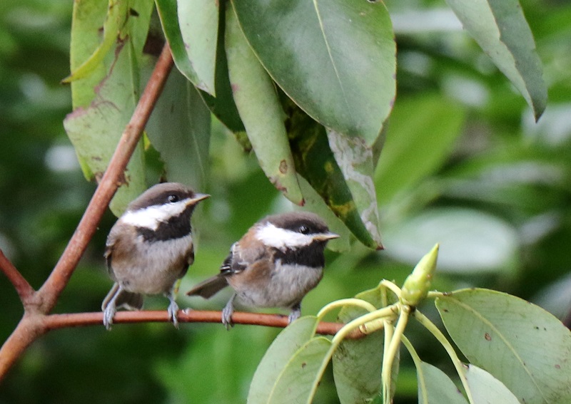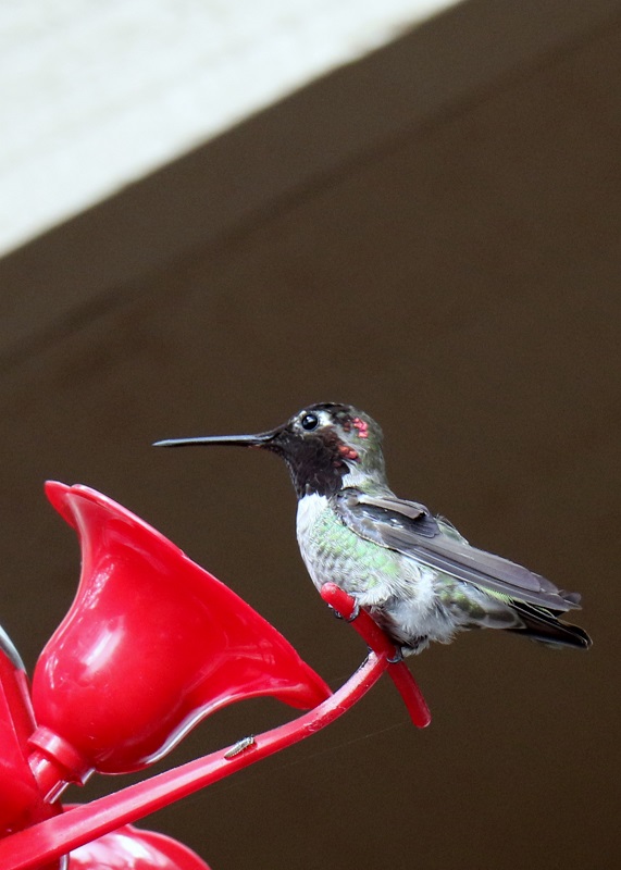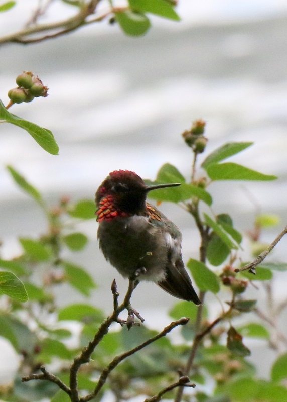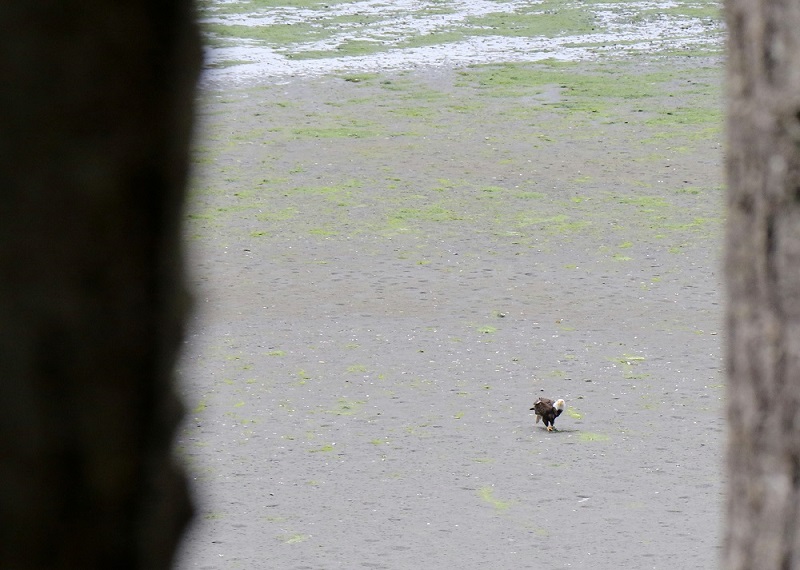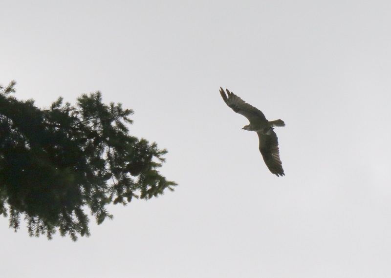 A bald eagle (Haliaeetus leucocephalus), far away below us, on the beach exposed by low tide, was eating a fish or a crab.These are two very young chestnut-backed chickadees (Poecile rufescens). They are still being fed by their mother, even though they are out of the nest! She is at the bird feeder nearby, out of the picture.The spotted towhee (Pipilo maculatus) is a large New World sparrow, about the size of a robin. The towhee has eyes that glint bright red in sunlight.This is an adult male of Anna’s hummingbird (Calypte anna). Even in the weak sunlight, the scarlet iridescence from its collar flashed now and then, as it turned its head.This is probably a juvenile Anna’s hummingbird (Calypte anna), with the white on its throat.A Western osprey (Pandion haliaetus) in flight. They are superb fishers, dive-bombing into the waters to catch fish with their sharp talons.This is a red-breasted nuthatch (Sitta canadensis), that also likes to visit the feeder. This one is probably a female. They are bossy and make the little chickadees scatter when they come to the feeder.Anna’s hummingbird (Calypte anna) at the hummingbird feeder.