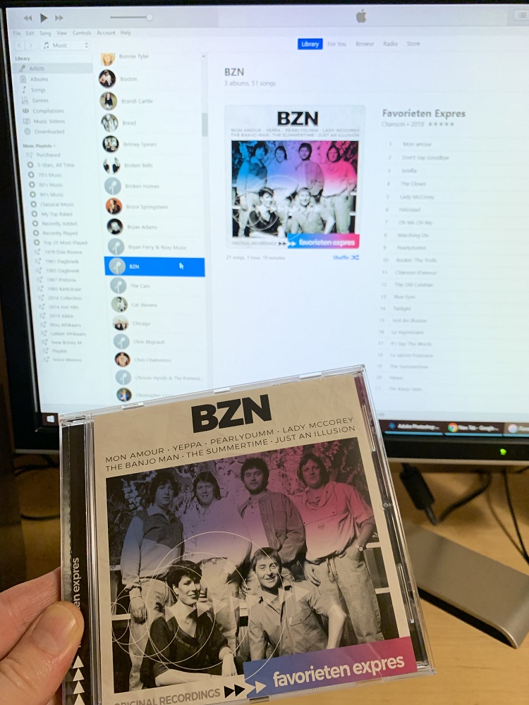 The CD is a 2018 compilation of 1980s songs from the BZN/ Band Zonder Naam (‘Band Without a Name’) band from the Netherlands. Very ‘meta’ (self-referential), that band name — I like it. I import my CDs into iTunes, old school. One of these days Apple will surely kill iTunes, and then I will have to find another solution for my music collection.