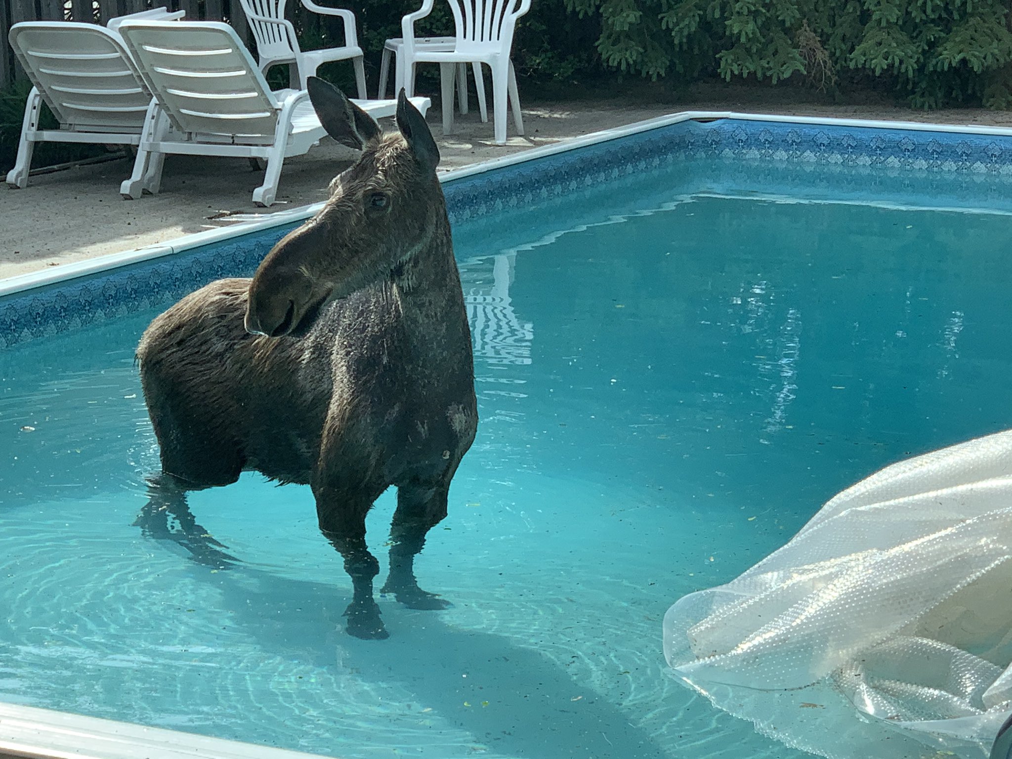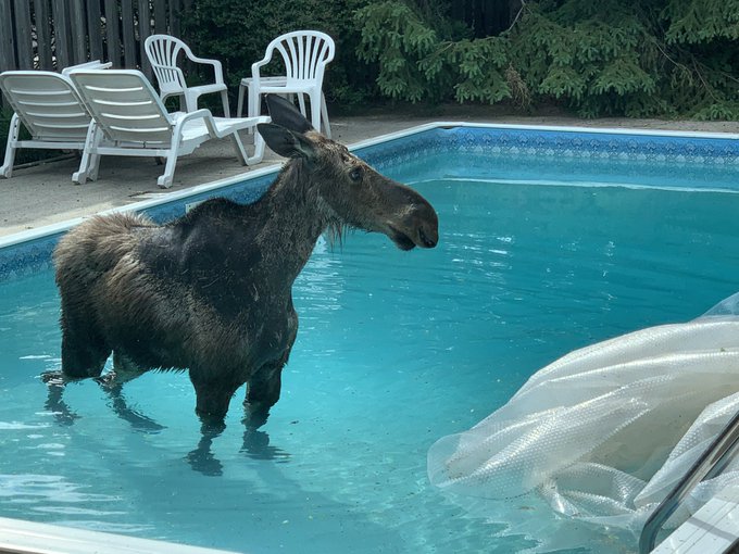 These pictures are from May, taken by a homeowner in Ottawa, Canada. Police and conservation officials arrived to help, but the moose found her way out of the pool and went on her way.