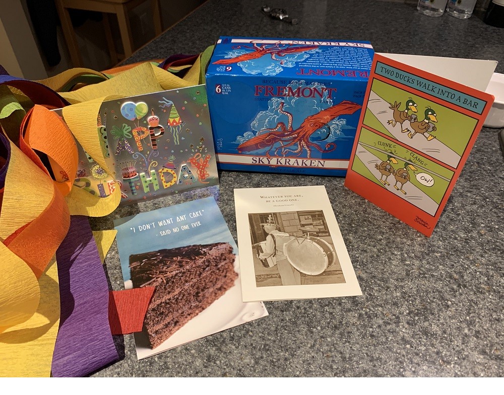 We sat a social distance apart from each other for beers, and pizzas from Olympic Pizza around the corner.