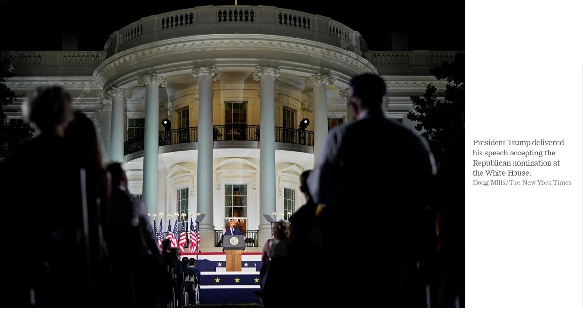 Here are some 1,500 people (very few masks, no social distancing in the seating), sitting through 71 minutes of Trump’s rambling acceptance speech for his nomination as the Republican presidential candidate, in front of the White House at the final night of the Republican National Convention.