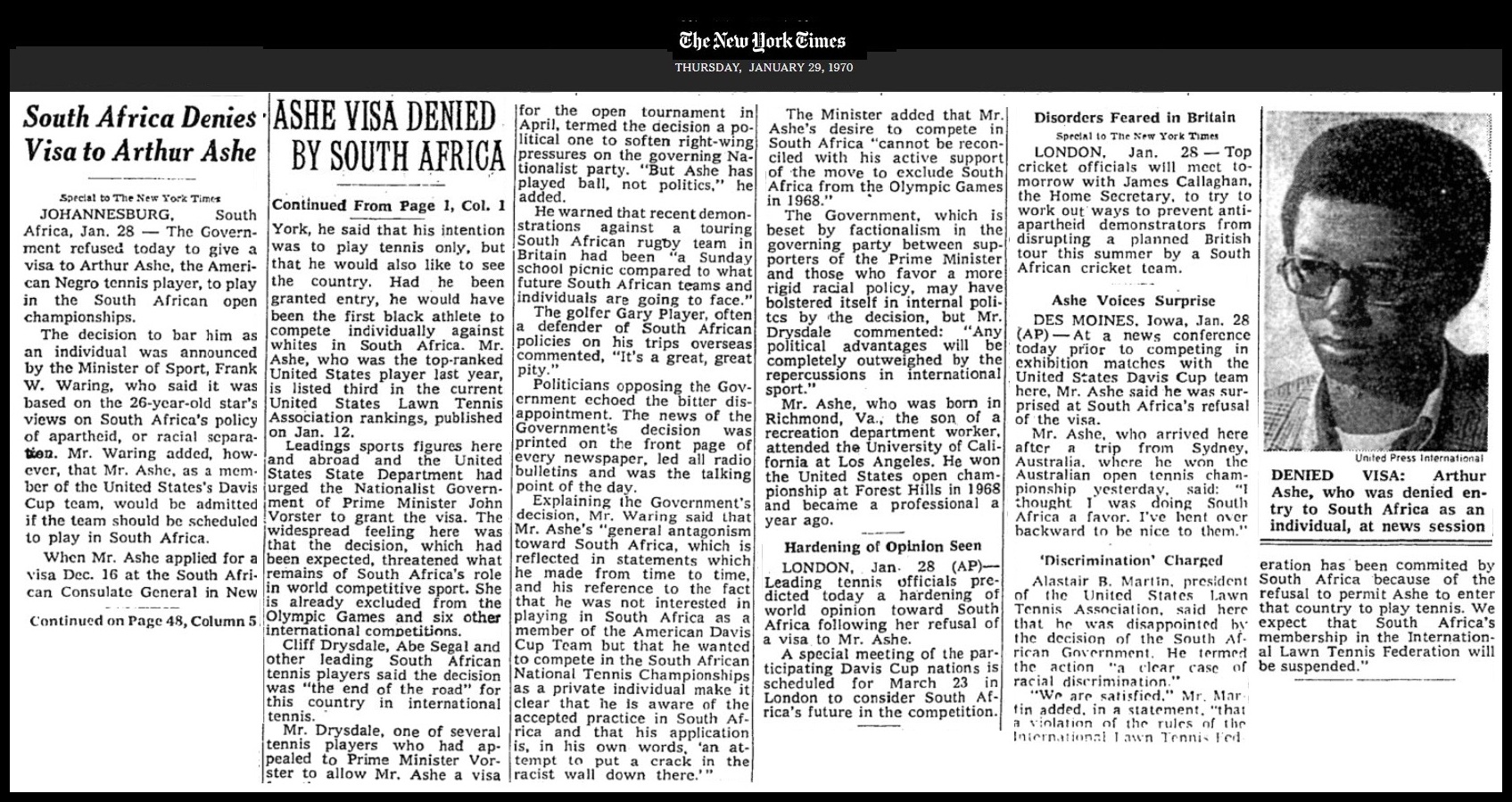 It was 50 years ago, in Jan. 1970, when the South African apartheid government took an outrageous stand: it refused Ashe a visa to play in the South African Open tennis tournament. The fallout and damage to South African sport were extensive. It solidified South Africa’s pariah status in the sports world. The country had already been banned from the Olympics in 1964 & 1968. It would be until 1992 before South African athletes could again compete in the Games.