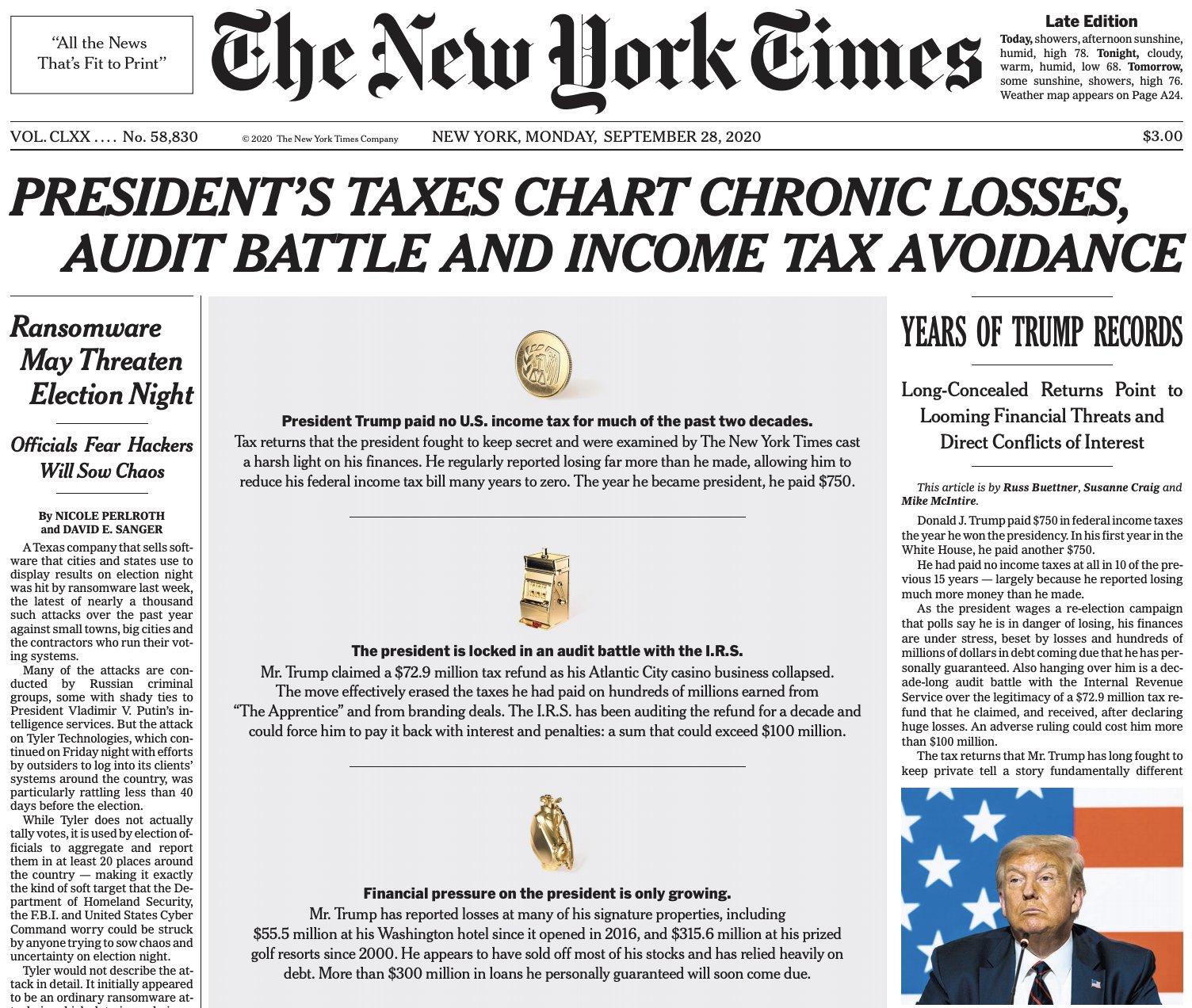 The New York Times has finally gotten its hands on more than two decades of Trump’s tax returns, up to 2017 (even Congress, with a lawsuit, has so far not been able to get it).