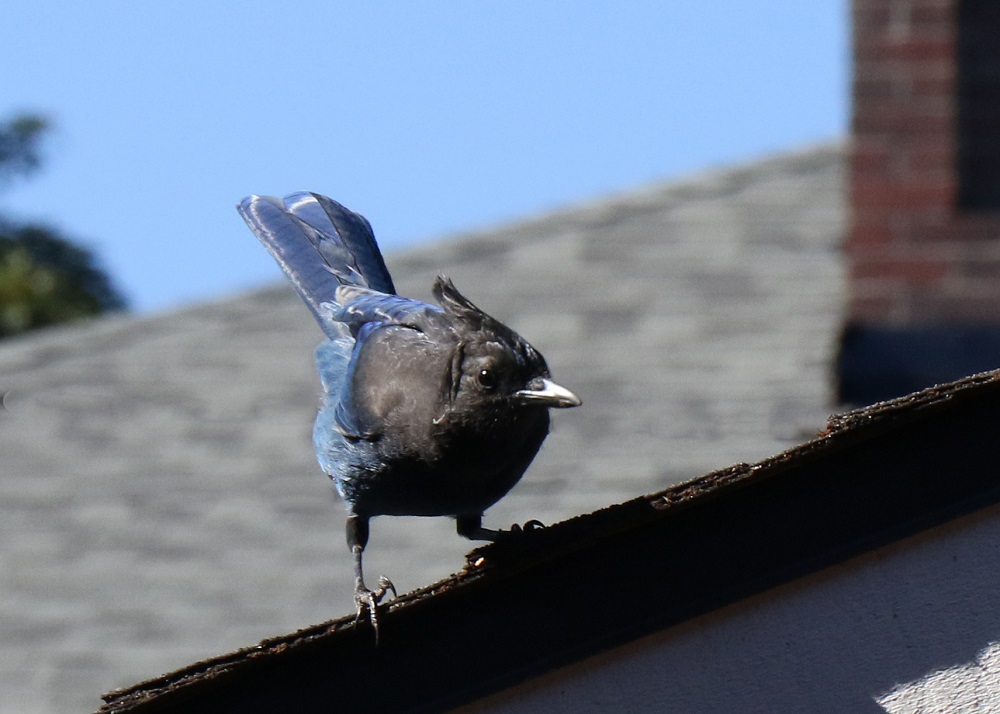This Stellar’s jay (Cyanocitta stelleri) was in my laurel fence, and hopped onto my garage roof for just long enough, so that I could take a picture of it.