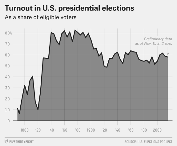 Not even 2 out of 3 eligible voters (US citizens older than 18) vote. 138 million, which is 58.1%, voted in 2016. Those 80% numbers from the 19th century are the most accurate available, but exclude large swaths of voters that were still disenfranchised. Women only got to vote in 1920. And it was really only in 1965 when the majority of African Americans in the South were able/ allowed to vote. Voter suppression efforts by the Republican Party continue to this day. Every election, voters from some states still report that they had to stand in line for 8, 9, 10 hours to vote. That is not democracy. That is voter suppression.