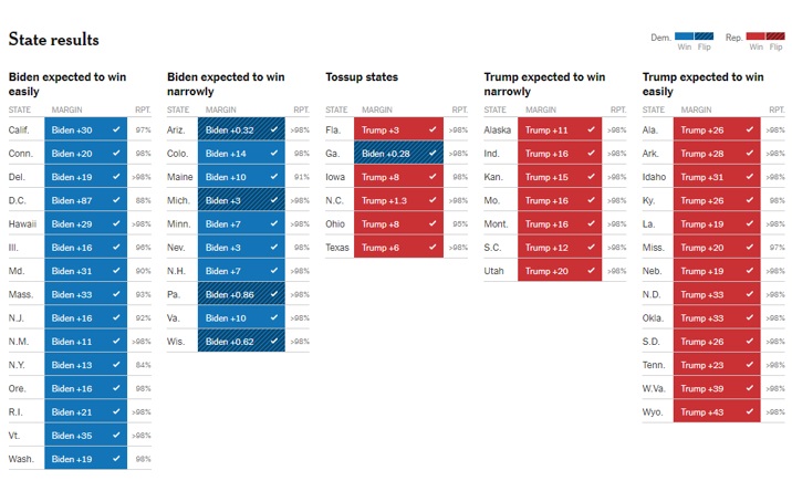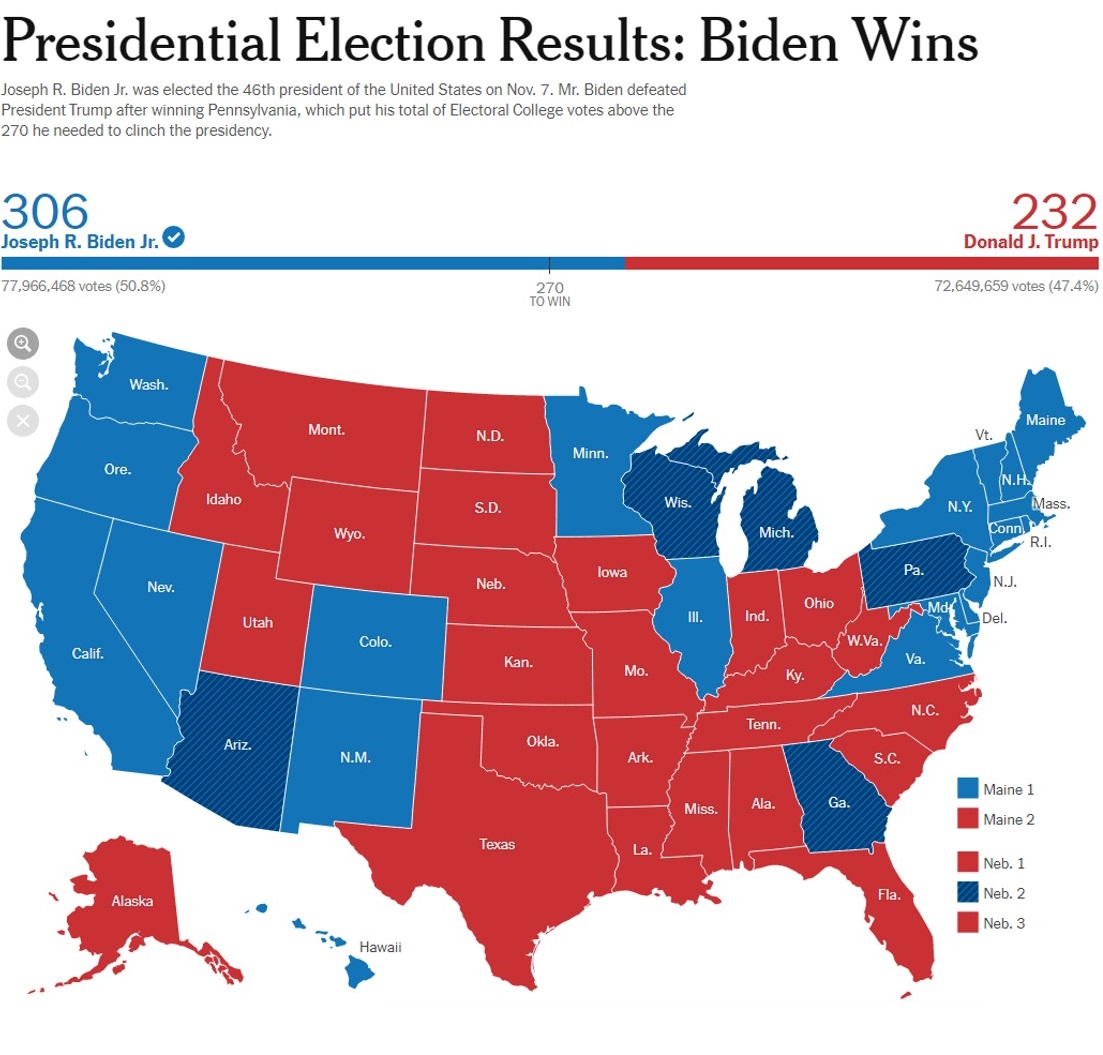 With very few votes still being counted, the New York Times and other news organizations now report that Biden has won Arizona and Georgia, and Trump has won North Carolina. Biden 306 electoral college votes, Trump 232.