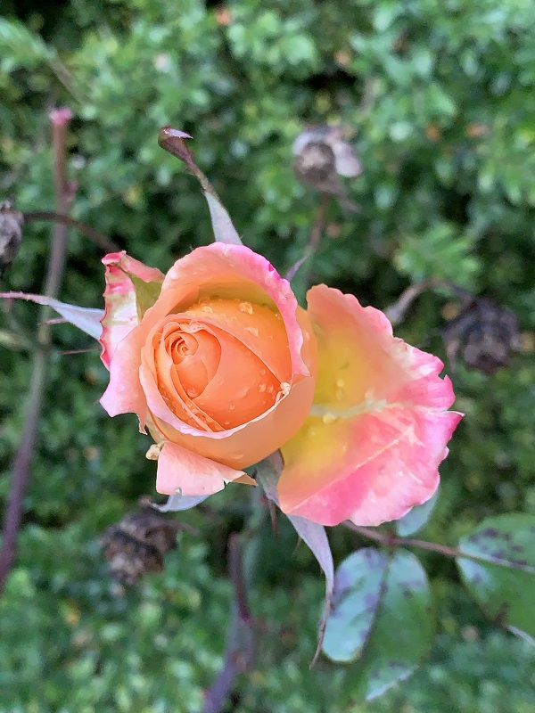 I don’t believe this bush has grafted shoots on, so this could just be the red from spring & summer, that has faded into salmon & pink.