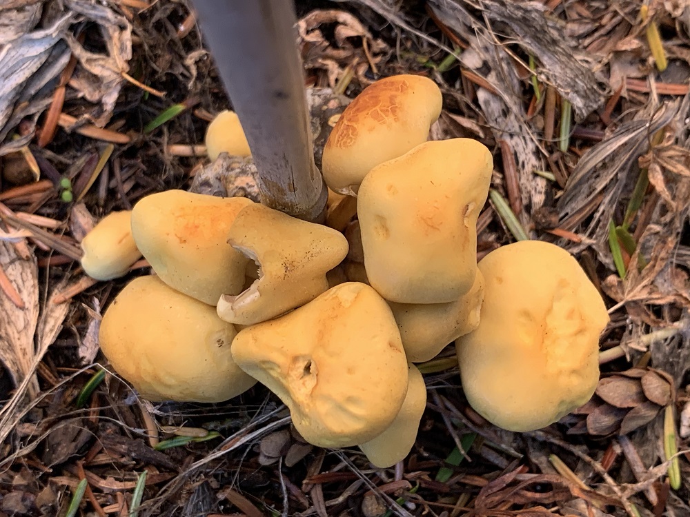 I have not seen these golden ones before in my backyard, though. Looks like they are golden Pholiota (Pholiota aurivella). They are supposedly edible; some people report that they taste like marshmallows without the sugar.