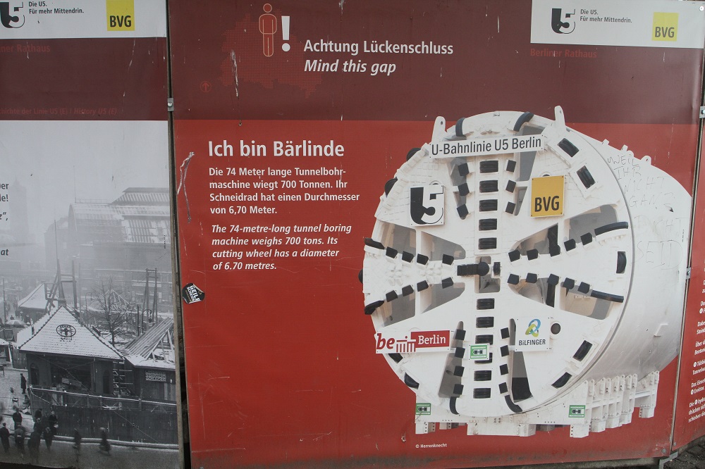 I took this picture of the Rotes Rathaus (‘red town hall’, opened in 1869) on Rathaus-straße near Alexanderplatz in 2015. Construction of the U-5 line extension and stations were already well underway.Here is the ‘Bärlinde’ tunnel boring machine they deployed. It is somewhat similar to the Bertha boring machine (dia. 57.5 ft/ 17.5 m) that was used in Seattle for the SR-99 tunnel, but this one is not nearly as big (dia. 22 ft/ 6.7 m).The new part of the U5 line dips down from the Brandenburg gate to the station called Museum Insel (museum island, an island in the Spree River), and then goes up again to Alexanderplatz.Inside the brand new Rotes Rathaus station on the U5 extension. [Picture credit: Der Tagesspiegel/ Annette Riegel]“The U-5 crackles with History” Come in! With 50,000 people that will be able to change between lines 5 and 6 in the new Unter Den Linden station, according to BVG, the city’s mayor hopes for a revitalization aboveground. He imagines concerts on Museum Island with fewer cars that are driven, and people can converse undisturbed.Here is the history of the U5 line that now stretches back almost a century, to 1927. [Graphic from Der Tagesspiegel]