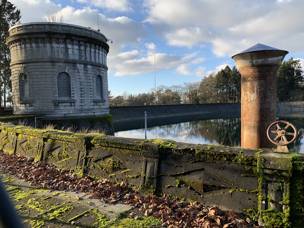 Here’s the Volunteer Park reservoir, here on Capitol Hill in the city. Its water is not considered usable for drinking water (the city has already covered several other reservoirs with lids, but not this one). The Cedar River’s water filled the 22 million-gallon reservoir for the first time in January 1901. The chlorophyll in the moss on the parapet (low wall) around the reservoir, is glowing neon green in the sunlight.Here’s a female mallard (Anas platyrhynchos), at one of the two duck ponds near the reservoir.The male with its glossy green head, doing the duck thing, paddling in the water. Mallards are dabbling ducks: freshwater ducks that feed in shallow water by dabbling and upending as they look for food.This species is the main ancestor of most breeds of domesticated ducks (the white ones that are kept for their meat, eggs and down). Mallard ducks were first domesticated in Southeast Asia, at least 4,000 years ago. [Source: Wikipedia]