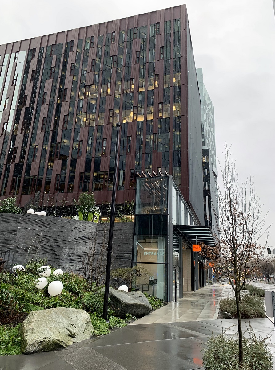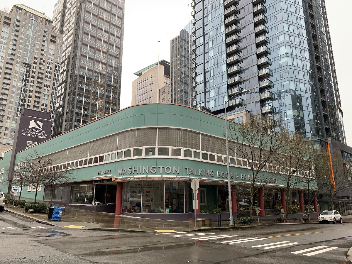 The two-story Streamline Moderne-styled building of the Washington Talking Book & Braille Library is at Ninth Ave. & Lenora St. It was previously a Dodge dealership, the anchor of Westlake Avenue’s long-departed auto row. Streamline Moderne is an international style of Art Deco architecture and design that emerged in the 1930s.Westlake Ave. & Seventh Ave. Here comes the South Lake Union Streetcar. It’s empty. ‘Experience the virtual world of Minecraft like never before‘, says the lettering on the side. Hey, that’s OK. I’ll pass. Wild enough to experience the pandemic world of Covid-19, like never before.I like the inside-outside seating area that had been set up across from the Amazon biospheres. There is an impressive extraction fan system in the green enclosure, for sucking out wayward SARS-CoV-2 virus that may be suspended in the air.This brown office building on Eighth Ave. off Westlake Ave. is now called Amazon The Summit. The lights are on in a few offices in the middle, but the rest is dark.This self-reflecting tower next door to The Summit is called Amazon re:Invent (520 ft tall, 37 floors, completed 2019). That’s the Cirrus Apartment building reflected in the bottom of the picture (440 ft tall, 41 floors, completed 2015).Another view of the Cirrus apartment building on the left, and the Amazon re: Invent on the right.Here’s Urban Triangle Park, with one of several 6-ft high aluminum Holding Hope signs, a new art installation now on display in several locations throughout downtown Seattle. I was supposed to take a selfie there, and post a picture with the tag #HoldingHopeSeattle on Instagram, Twitter or Facebook. I guess my blog does not count. For every post, the Downtown Seattle Association will make a $10 donation to the Pike Place Market Foundation.