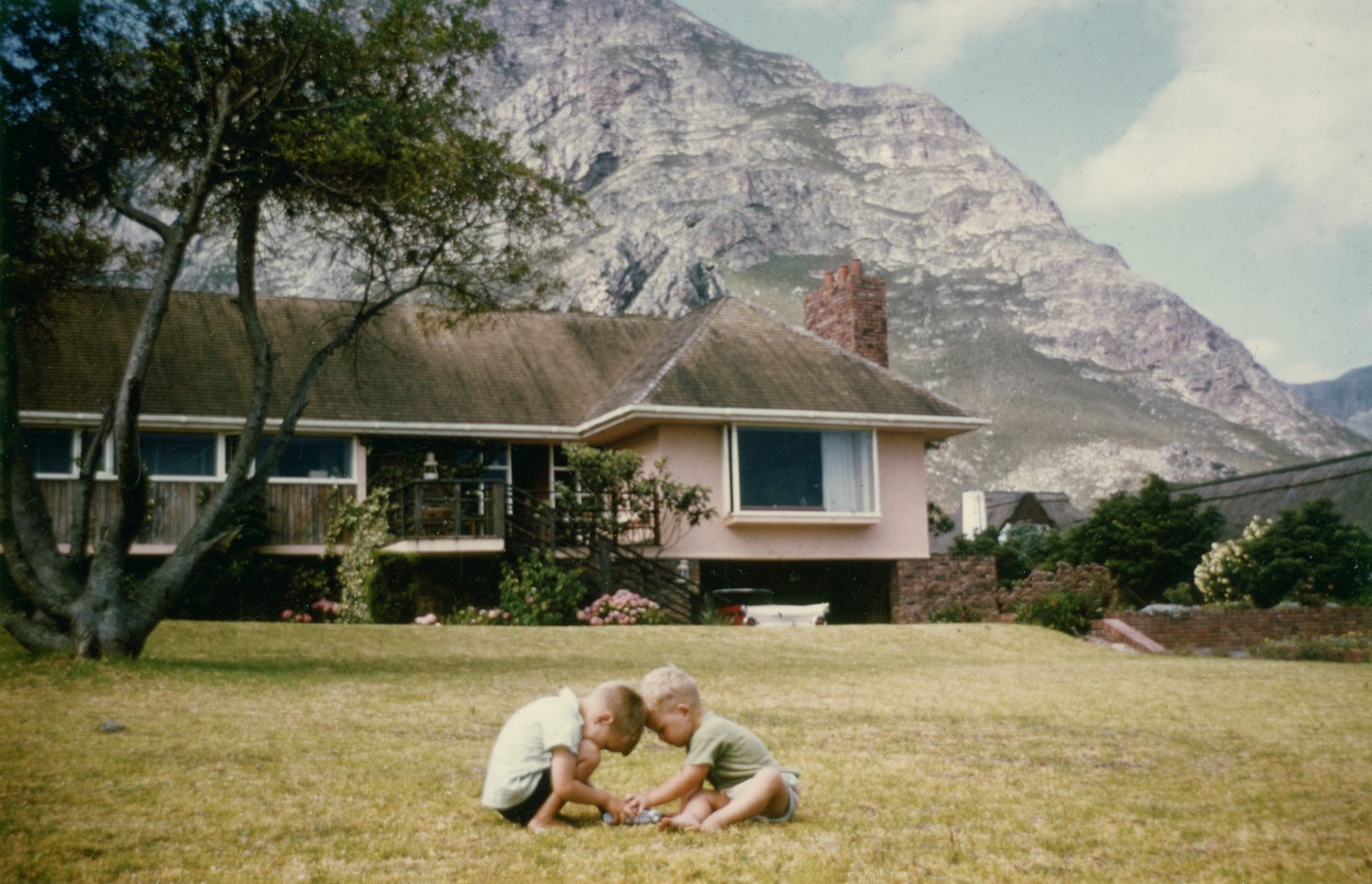 1964. That’s my brother and me (on the right), on the lawn of a rented beach house in Hermanus (a 90 min. drive from Cape Town, to the east). And what magnificent machine would that be in the garage? It’s my dad’s 1959 Ford Fairlane (it had a V8 engine). The name is derived from Henry Ford’s estate, Fair Lane, near Dearborn, Michigan.