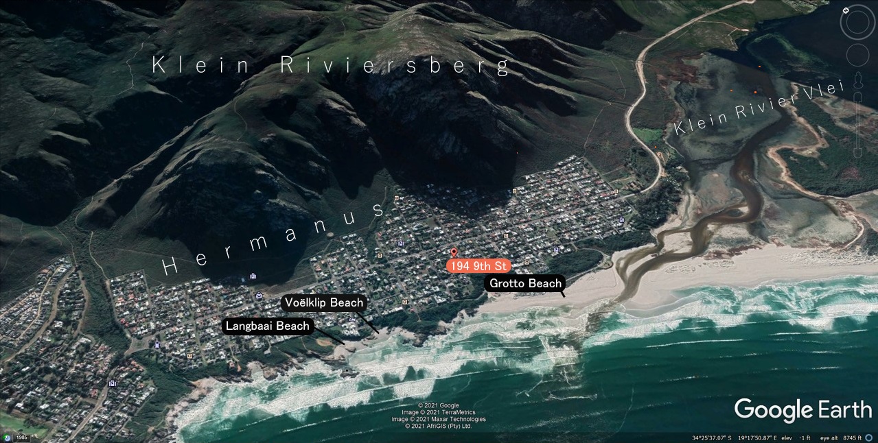 2021. So, some 57 years later. New roof & new paint on the house (of course), The brick chimney is still there. The hydrangea, ivy and big tree are all gone, but at least there is another tree or two. [Google Street View, Sept. 2010].And here’s a Google Earth view of the area, looking northwest. I added some annotation. The house was just about three blocks from the beach. The ocean water is frigid, though. The shores here catch some of the cold Benguela Current from the depths of the Atlantic Ocean. The main road that runs through Hermanus is Route 43 (R43). On the right of the picture is a vlei (a shallow, minor lake, mostly of a seasonal or intermittent nature) that is now part of a nature reserve. [Picture generated with Google Earth].