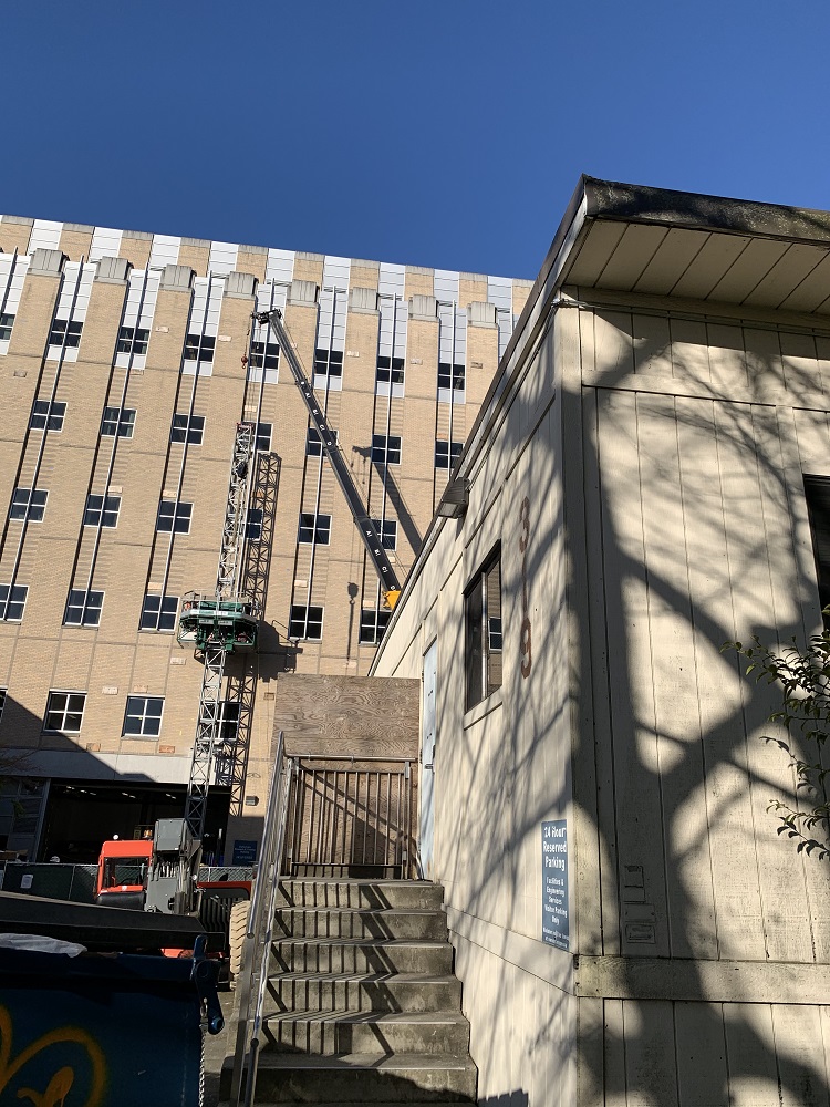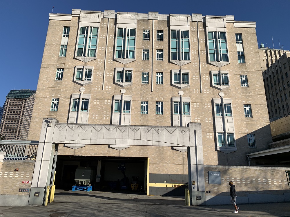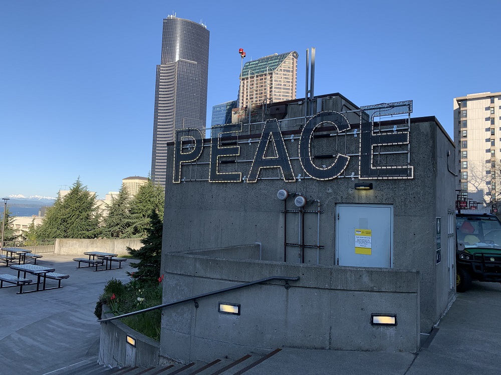 The Facilities & Engineering building on Terrace Ave (on the right) is where the Harborview hospital’s vaccination clinic is run out of. I had just exited down the stairs.One of the hospital’s delivery gates. I’m making my way back to the big parking garage overlooking I-% and downtown Seattle.I love the Art Deco detail on the buildings. The construction was completed around 1931.The entrance off Eighth Avenue. Harborview Medical Center is the only level 1 trauma center* for Washington State. *Capable of providing complete, life-saving care for the most seriously ill or injured patients, through rehabilitation.The roof of the parking garage off Eighth Avenue, across from the entrance to the hospital. Last year in November I thought the PEACE letters was for the holidays, but looks like it has became a permanent installation (and why not). That’s Columbia Center (cpl. 1985) and Seattle Municipal Tower (1990) in the back.