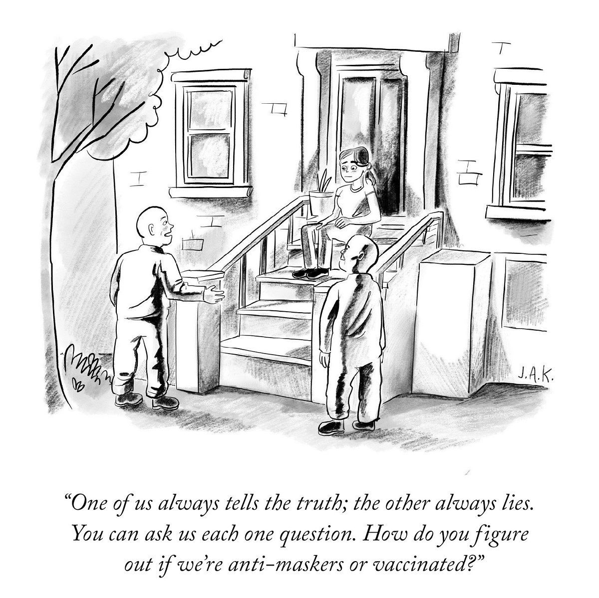 This is surely a variation of the Liar Paradox. Someone on Twitter said the solution is to ask each one, how the other would answer to something like ‘Are you vaccinated?’ .. but that would assume that they know each other’s status. Hey .. I say, the earnest guy on the left is vaccinated, since he thinks it’s important to be able to tell who is vaccinated and who is not. The guy on the right looks mean and upset with what’s being discussed. So to me it looks like he’s an anti-masker and unvaccinated, to boot. 🙂 [Cartoon from The New Yorker, by J.A.K. @JasonAdamK on Twitter]