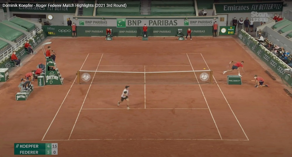 Federer at full slide, and full stretch, going for a very wide angle drop shot return from Koepfer.He flicked the ball back over the net and Koepfer was not able to volley the ball back. BY THE WAY: That silly green box with ‘Peugeot’ on it was in the way. With these wide-angled shots, it’s perfectly fine to play the ball back super-low, and into the opposite court, by going AROUND the net post.