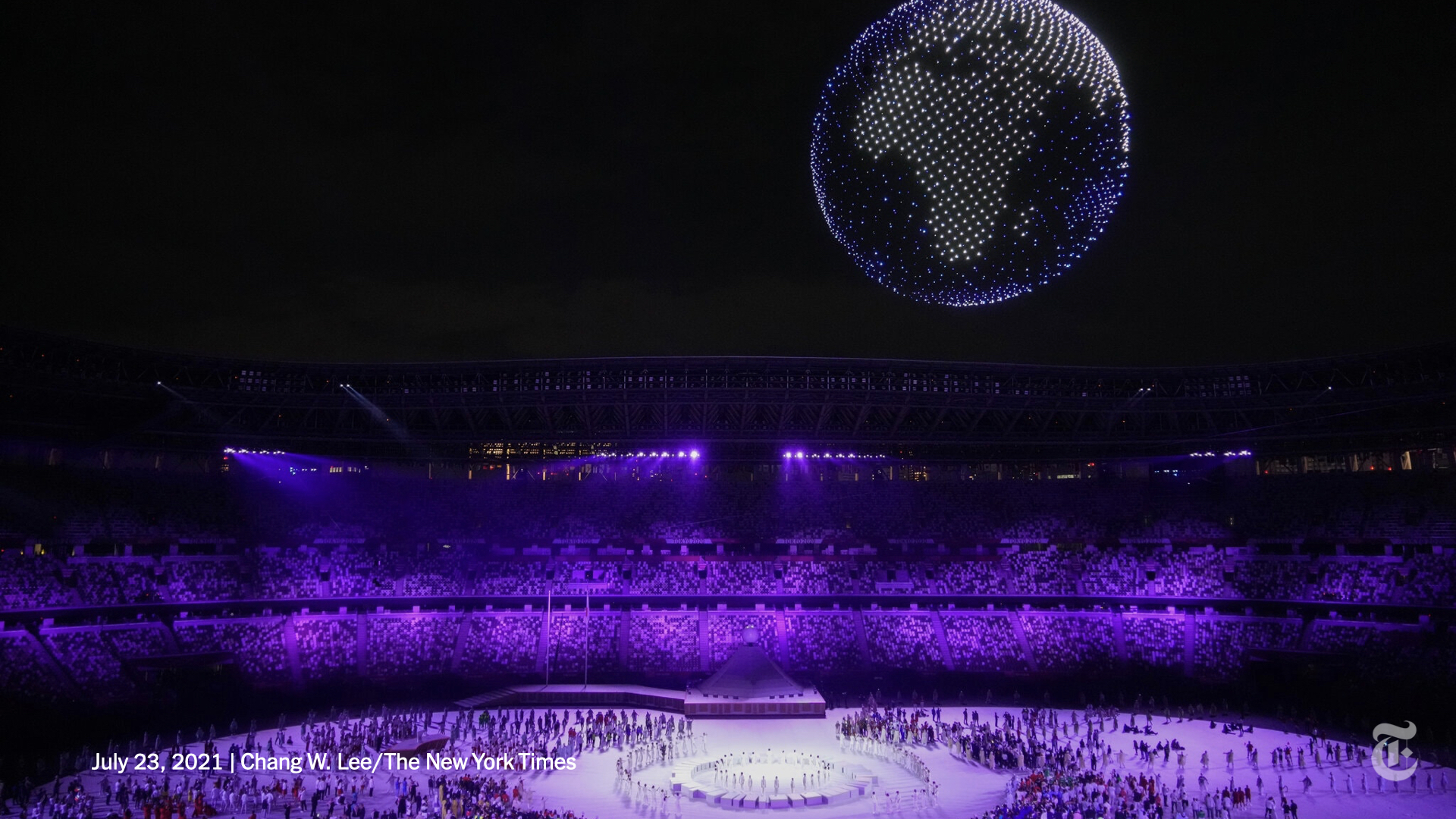 I love the ‘Earth’ made up of 1,824 drones up in the sky, while John Lennon’s Imagine played below. The drones were programmed by chipmaker Intel, who first brought drones to the Winter Olympics in 2018. [Picture by Chang W. Lee/ New York Times]