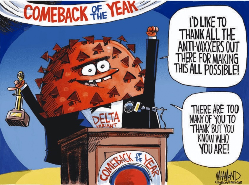 I’m watching an interview that Bill Kristol is having with Dr. Ashish Jha (Dean of the Brown University School of Public Health). Dr. Jha explains that there is 1,000x more of the virus in the nose & throat of Delta variant patients vs. others. An infected person with the Delta variant infects on average 6-8 others (it used to be 3-4 others with the Alpha variant).