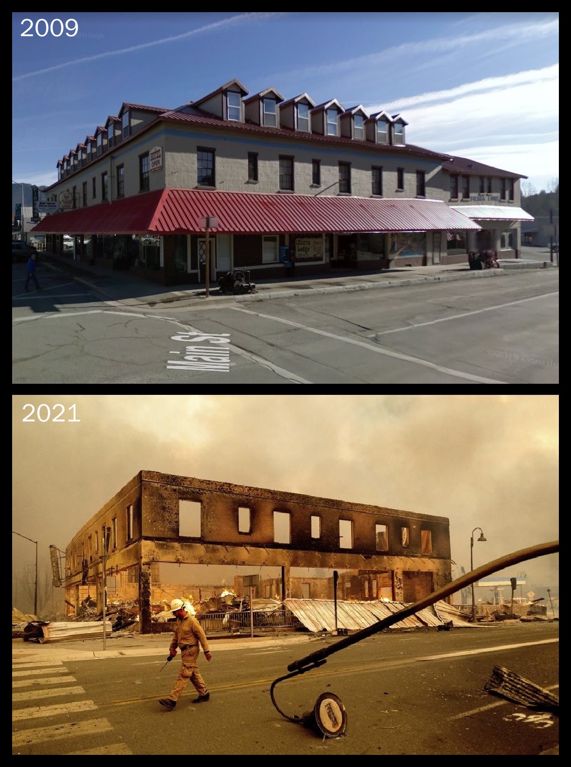 2009 Google Streetview picture of the Sierra Lodge on Main St. in Greenville, Ca. 2021 Operations Chief Jay Walter passes the Sierra Lodge as the Dixie Fire burns through the Greenville community of Plumas County, Calif., on Wednesday, Aug. 4, 2021. The fire leveled multiple historic buildings and dozens of homes in central Greenville. (Associated Press Photo/Noah Berger)
