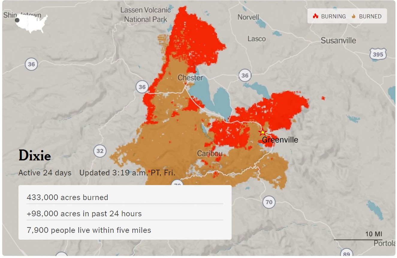 I marked the location of Greenville on this map. By Friday Aug 6, the Dixie Fire had become the third-largest wildfire on record in California.  [Map by the New York Times © Mapbox © OpenStreetMap]