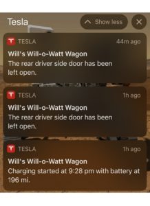 As I stepped into the house, the car reported ‘The rear driver side door has been left open’ on my phone. Well, it was open for a minute or two but I’m sure I closed it, I thought. I popped my head into the open garage door. Yup, it’s closed.