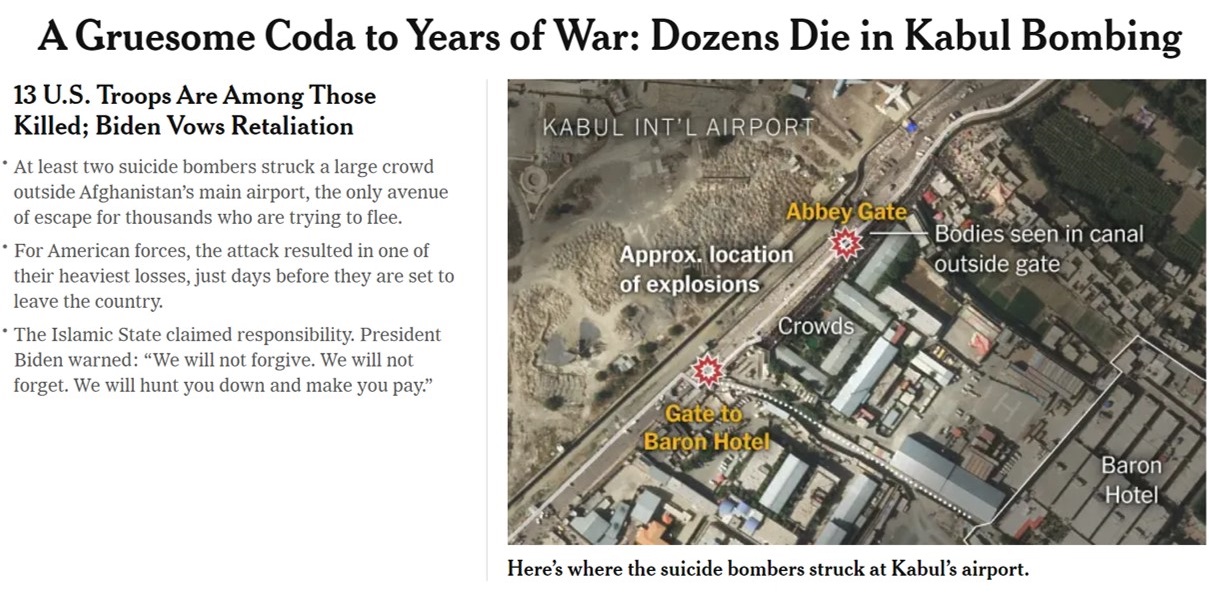 P.S. The Pentagon indicated later that there was in fact only one suicide bomber: the one at the Abbey Gate. There was no explosion at the gate to the Baron Hotel.
