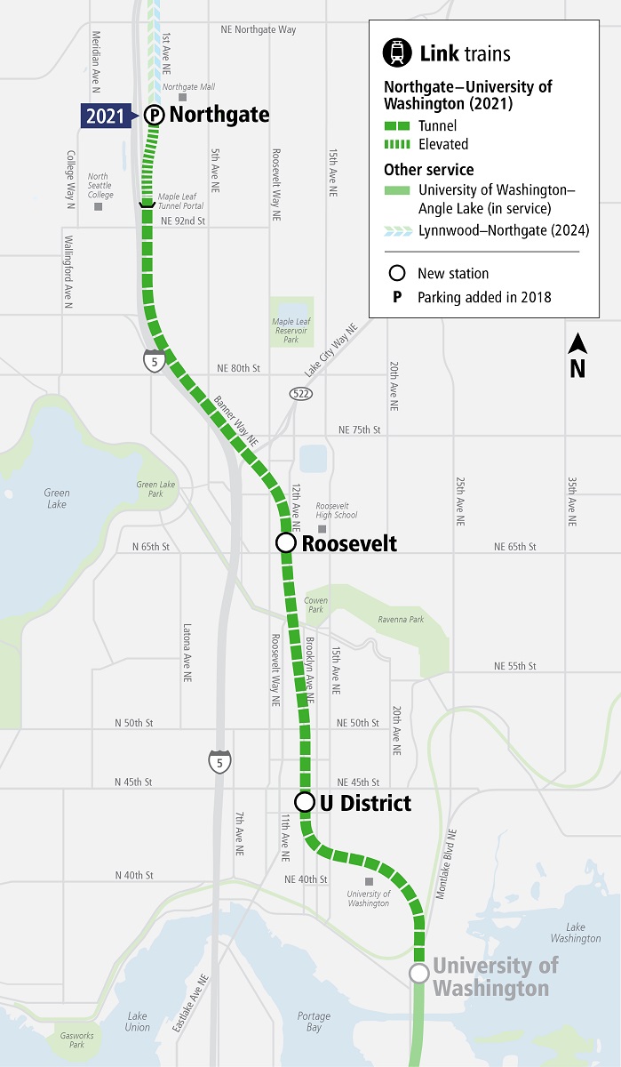 Today marked the opening of the 4.3-mile extension of the Seattle area’s Link light rail system towards the north, with three new stations: U District, Roosevelt and Northgate. These are the final stations in the system that was proposed to voters in 1996. So it took twenty-five years to get it all planned and built, a lot longer and much more expensive than planned, but it’s here at last. The price tag for this last phase was $1.9 billion.