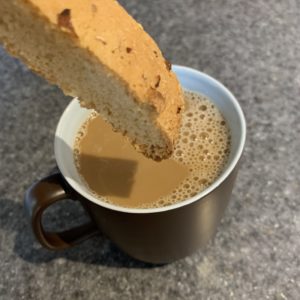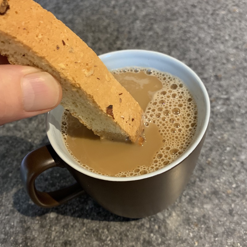 The biscotti are so dry that I dunk them for less than one second in my coffee, and then they are all soaked up and ready for eating.
