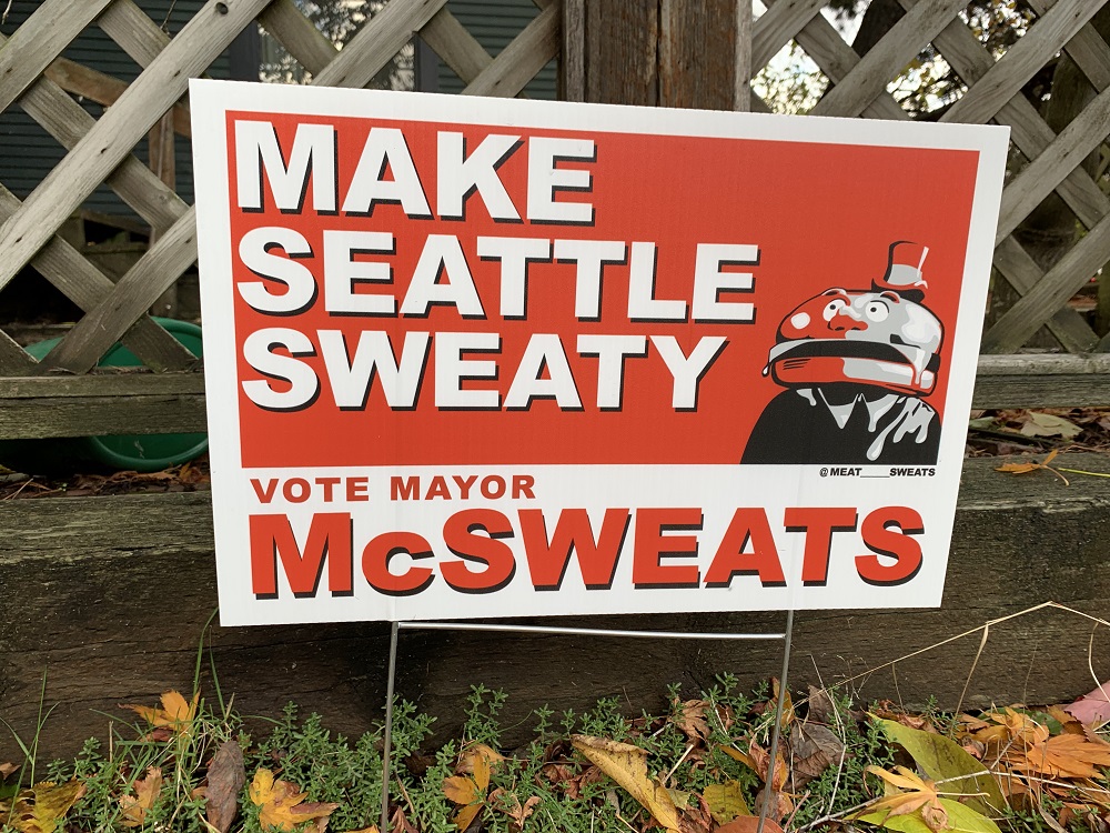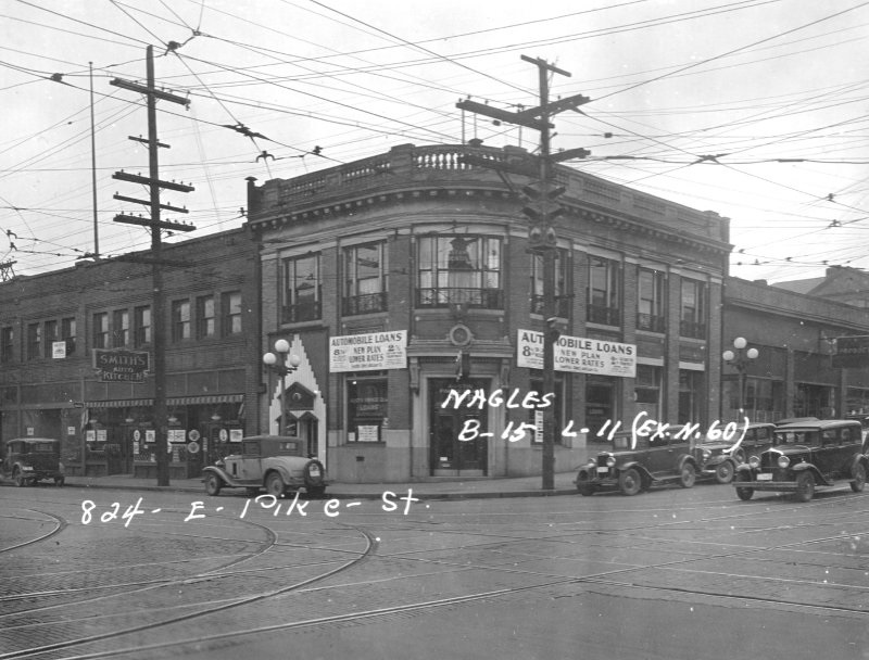 Pay to park, and pay by phone only. I guess the city saves money by not installing parking meters, and I guess you cannot park here if you don’t have a smart phone :). At the back are two new apartment buildings going up. One is at 1400 Madison Avenue, a 7-story, 365-unit apartment building with retail.The ‘Knights of Columbus’ building at 722 Union St. Before it was sold to real estate investors in 2018, it belonged to the Catholic Church’s namesake and largest lay organization, a fraternal order founded in 1882 to support church programs and serve charitable causes. This building from 1913 held notable lunches, dances and other events. The gym and swimming pool in the basement were used by servicemen during World War II. It is getting rehabbed and retrofitted to withstand earthquakes, and the two parking lot parcels adjacent to it will be used for constructing apartment buildings. (Note to new owners: that red entrance canopy needs to go).Tuesday Nov. 2 is when the election for Seattle City mayor and other positions take place*. Nikkita Oliver (pronouns they/them) runs against Sara Nelson for a position on the Seattle City Council. Says local public radio station KUOW on their website: Nikkita Oliver is an educator, attorney, and activist who wants deep systemic change to move the city further to the left. Sara Nelson is a small business owner who thinks the current City Council is already too far left and needs to move closer to the center. *We vote by mail, so many votes are already in; mine is as well.There are lots of empty storefronts in the city. This Broadway State Bank building opened in 1913 (see photo below). In recent years it housed a Tully’s Coffee and a Starbucks Coffee. This Broadway & Pike Street corner is a little rough, though. Just a few weeks ago while I walked by, a guy that was on drugs or mentally ill— or both— rolled around in the street, resisting attempts by a Good Samaritan to drag him to safety. The police showed up just a minute later.Here’s a 1937 photo of then-Broadway State Bank, constructed in 1913. I’m sure business from the auto dealers nearby was still booming in 1937. About its construction, the Seattle Times wrote in 1913 “Absolutely fireproof” and “Built of steel and concrete, with cream glazed brick finish”; “the new Broadway State Bank will be one of the finest in this rapidly developing district.” (Information obtained from the Capitol Hill blog).Just half a block up on Broadway, and what have we here? Well, an 8-story, 118-unit apartment, retail, and institution building (community center) under construction. The Seattle-in-Progress website says ‘Project includes renovation of the Atlas Building and Eldridge Tire Building. Atlas Building façade to be rebuilt. Eldridge Tire Building façade to remain’. Looks to me like ‘reconstruction’ and not ‘renovation’.A fake/ gag poster for Seattle mayor. (The two candidates in the Nov. 2 general election for Seattle mayor are Bruce Harrell and Lorena Gonzalez). And who or what is McSweats? Urban Dictionary to the rescue: ‘McSweats is the ill-desired after-effects commonly felt after gorging on McDonalds burgers to unnecessary extremes’.