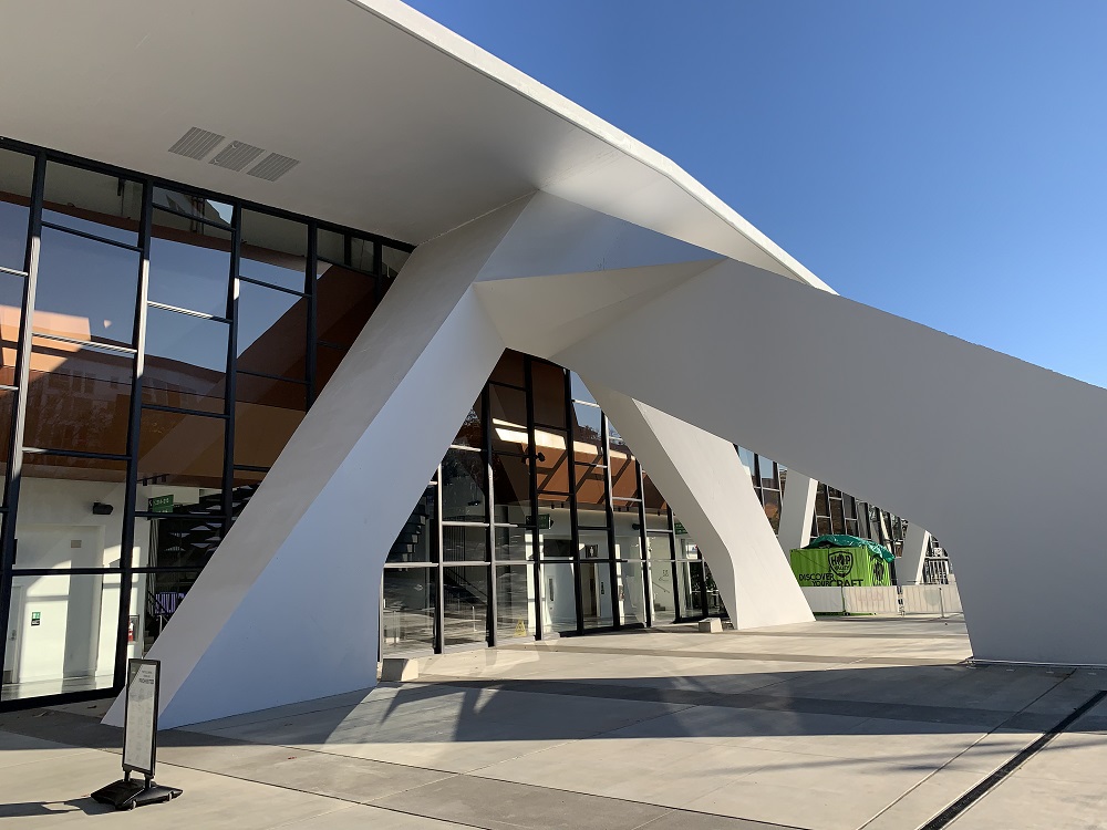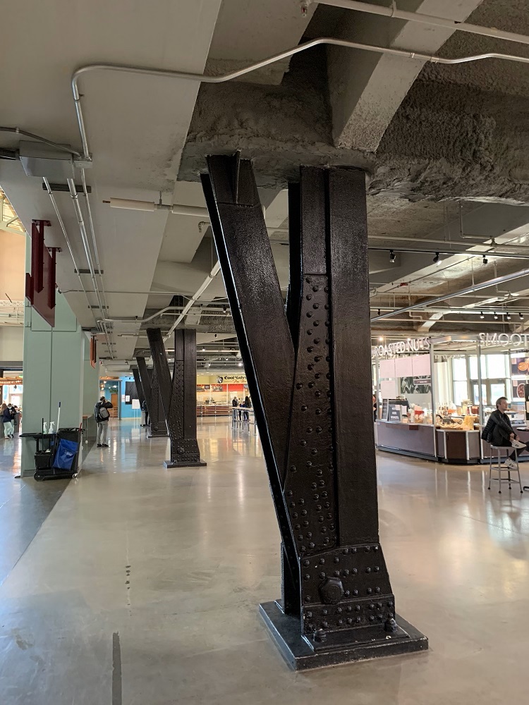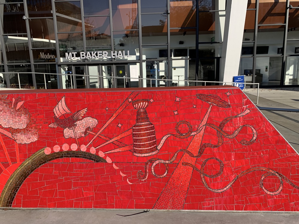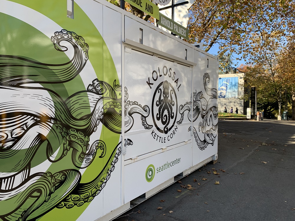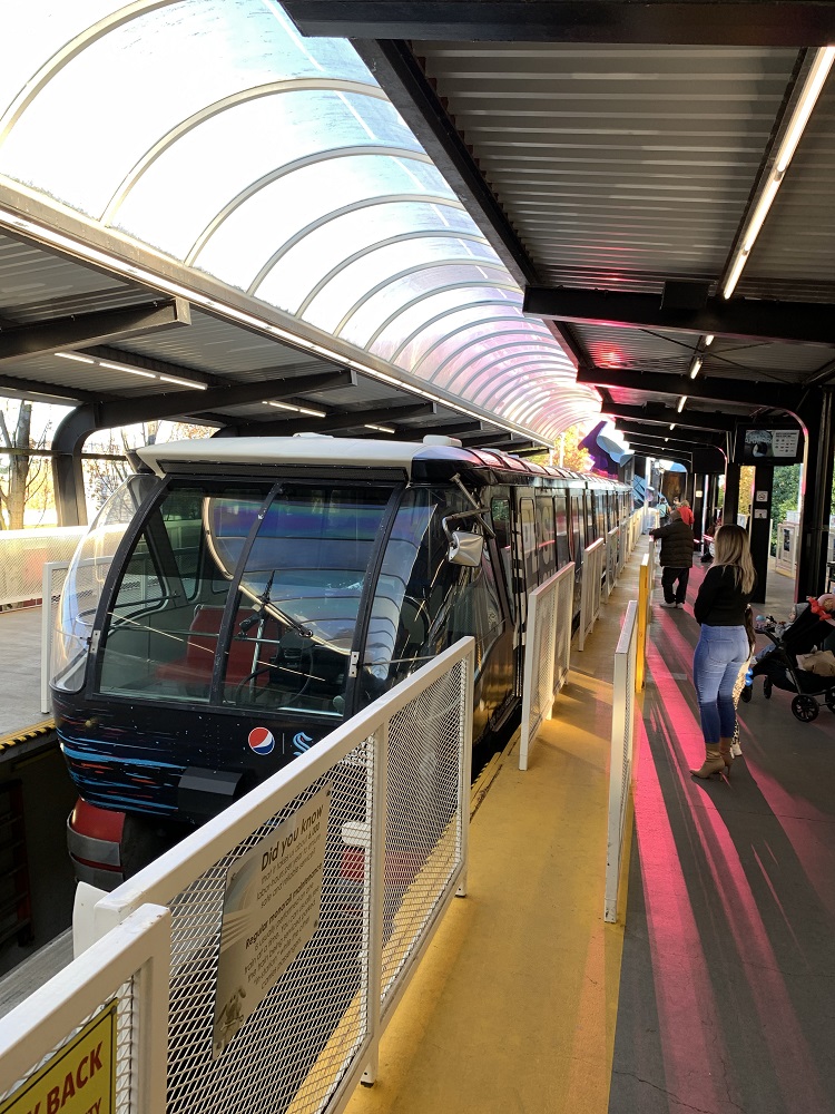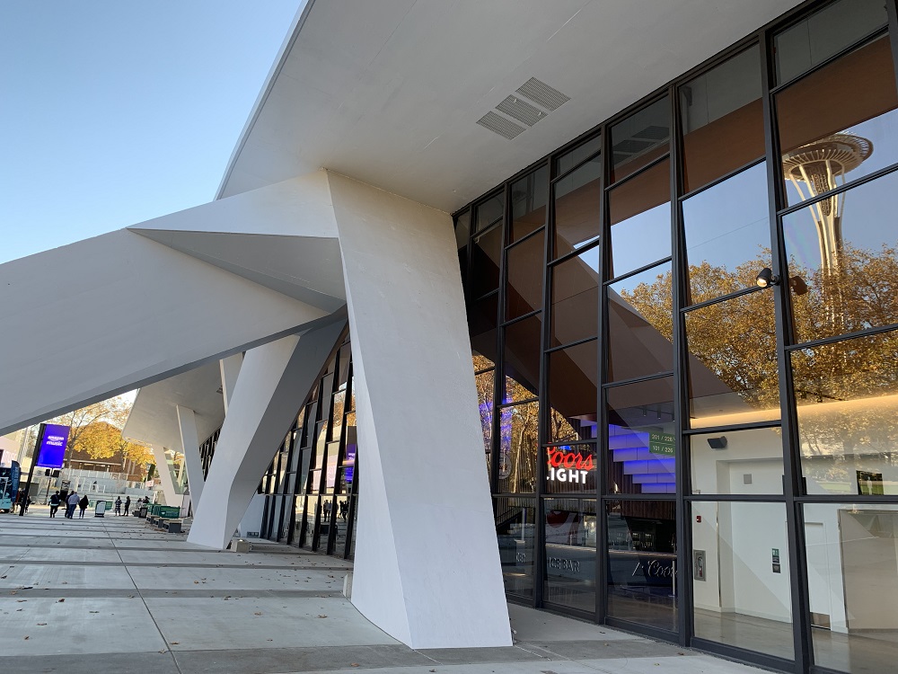 Just departed West Lake Center on the monorail train. Look for the Space Needle in the distance.Arrived at the Space Needle. Climate Pledge Arena is just a short walk away.I walked through the Seattle Armory building on the way to the Arena. Originally built in 1939 as the old Armory Building, it housed the 146th Field Artillery and its half-ton tanks. It now houses a food court and a little bit of some entertainment for families (games to play and a few TV screens).The trees are bare — and the shadows are already long, even though it’s only 3.15 pm or so! The Pacific Science Center in the distance.Food vendors at Seattle Center are connecting their offerings to the new Seattle Kraken franchise.All right, here is the first view of the Climate Pledge Arena, this from its southeast corner.Looking back at the Space Needle. The Arena and the Needle were both conceived and constructed for the 1962 World’s Fair.Rounding the corner to the side facing 1st Ave N in Uptown, the neighborhood just south of Queen Anne. The roof looks heavy and is heavy: 44 million pounds or 22,000 tons (20 million kg or 20,000 metric tons).Mt Baker (10,781′/ 3 286 m) is up north in Washington State near the Canadian border. The mosaic artwork is by artists Laura Hadad and Tom Drugan. That would be the Stanley Cup, and ribbons and rainbows morphing into tentacles, lashing at an ill-fated wooden ship on the oceans.The center support beams, seen from 1st Ave N.These black window frames (and window panes, I think) from the old Key Arena were salvaged and reused.From the north side, one can stand on a low wall and peer into the bowl with the ice-rink bottom. The enormous LCD screen (46 ft wide by 25 ft high) is playing clips of local interest, and commercials. Just a few hours later, at 6.00 pm, the Seattle Kraken took on the New York Rangers right there on the ice. The Kraken lost 1-3.Almost back to the corner where I had started.Looking back at the Arena, as I enter Seattle Center park to walk back to the Monorail station.Beautiful Art Deco entrance to the Armory building.And here is the monorail train that will run back to Westlake Center. It’s just 1.3 miles, and there are two trains, so they arrive and depart every two minutes or so from each end.Arriving at Westlake Center, and peeking through the skylight before stepping off the train. On the right is the new 58-story Rainier Square Tower, 850-foot (260 m) tall.