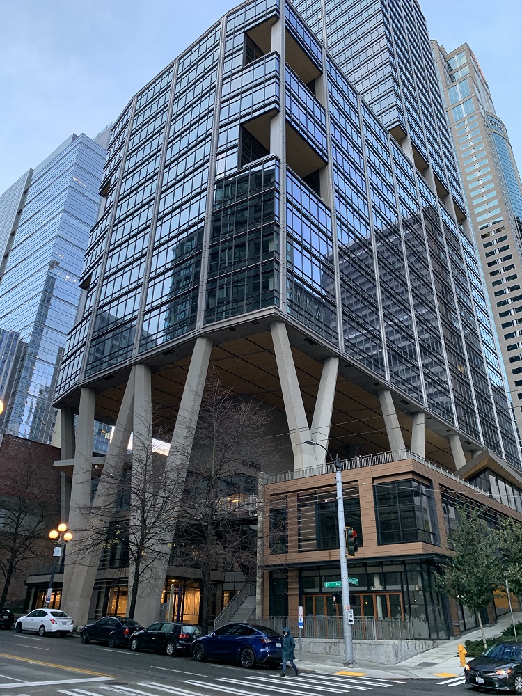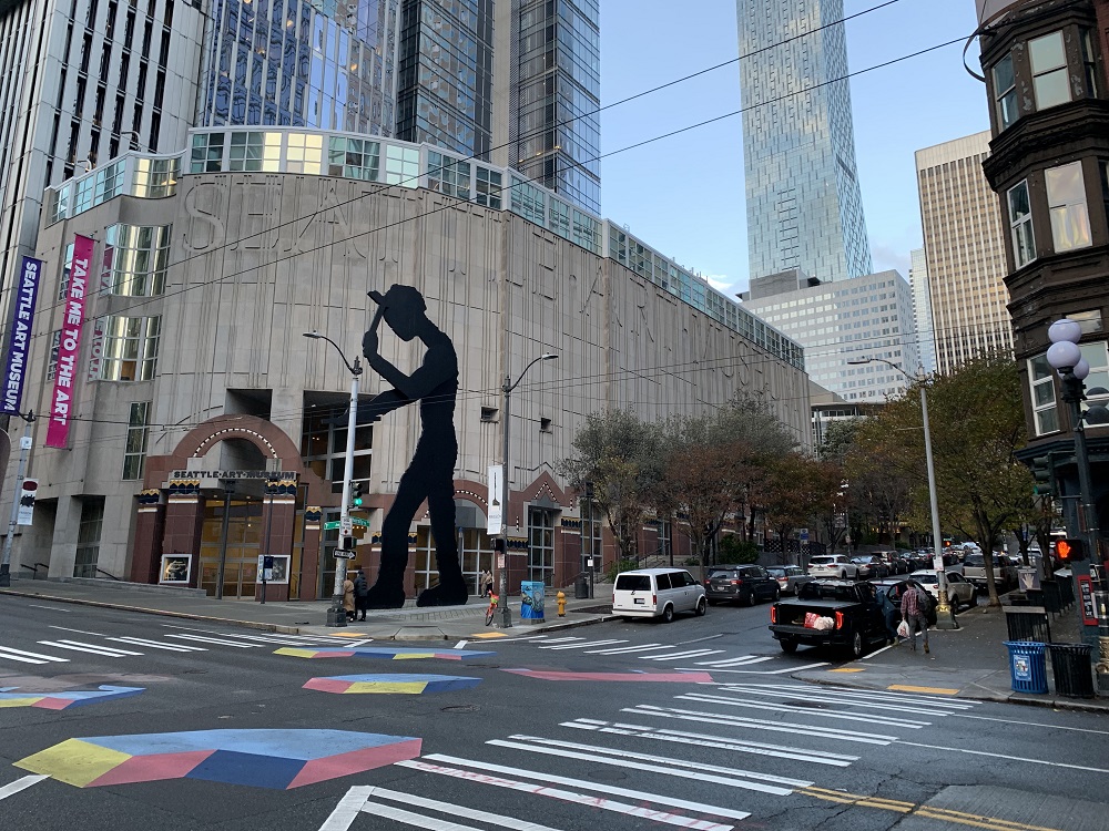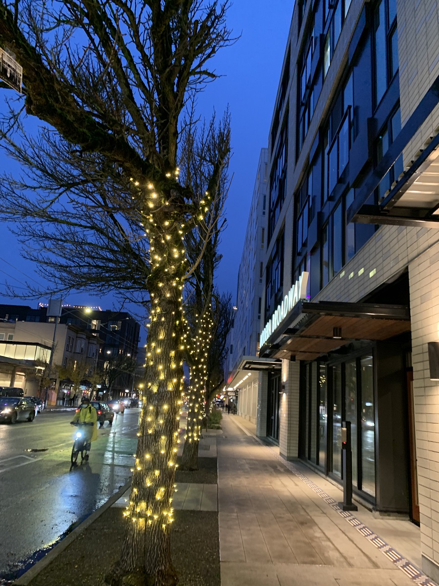 Here comes the marine vessel (ferry)Tacoma from Bainbridge Island— it must have been the 2.55 pm sailing. The crossing is about 35 mins, and the time stamp on this photo was 4.38 pm*. *Which is really 3.38 pm Pacific Standard Time. I forgot to turn off the Daylight Saving Time setting in my big Canon DSLR camera (it has no built-in Wi-Fi).Upstairs from the viewing deck at Pike Place Market. The Mountain is not out (Mount Rainier), but there is a little blue sky. Finishing up the waterfront space that opened up with the demolition of the Alaska Way Viaduct is coming along. That speck at the top left is a Delta Airlines plane on the way to Seattle-Tacoma airport.Now I walk down First Ave. for a bit. Here’s the Seattle Art Museum. See the 3-D optical illusion/’please slow down’ island in the intersection? I like it, but I wonder how many motorists notice it.Qualtrics Tower, formerly known as 2+U and 2&U, is looking good, sitting on its massive V-shaped pillars. Its 37 floors were all leased out by September 2019, but I’m sure it has yet to fill back up again with workers and tenants.There is a variety of ‘Welcome Back to Your Seattle’ signs adorning the lamp posts in downtown. This one is cute.I like this one, too. A leaf happened to be stuck right on the swoosh line running around the Space Needle and skyscrapers.The ten-story building (at 400 University St, on the southwest corner of the city block with the new Rainier Square Tower), is now complete as well.Hey! Macy’s the store is gone, but the building is there*, and so is its iconic 160-ft tall star. If I’m not mistaken, it was switched on early this year. *A real estate firm bought the building for $580 million earlier this year.These lights lining Fourth Avenue came on just as I turned around (and just in time to better see those approaching e-scooter riders).I was aiming to catch the No 10 bus at the old Convention Center building, but it rumbled by me while I was still a block away from the stop. I didn’t want to wait 20 mins for the next one, and ended up walking up to Capitol Hill.Here’s Broadway. It’s 5 o’clock and the sun has been gone a good 15 minutes. A fat rat scurried away from me up ahead and disappeared into the little bit of greenery on the sidewalk.