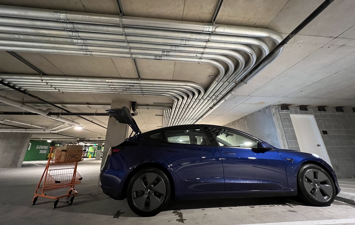 Nary a soul in sight in the parking garage by the Amazon Fresh store on 23rd and Jackson. There are people in the store, of course. A human checked my ID for the beer I had bought (why? Amazon must know my age; the credit card company certainly does). The smart carts are not allowed out of the store, so I put my two heavy bags in a regular little cart to get it to the car.