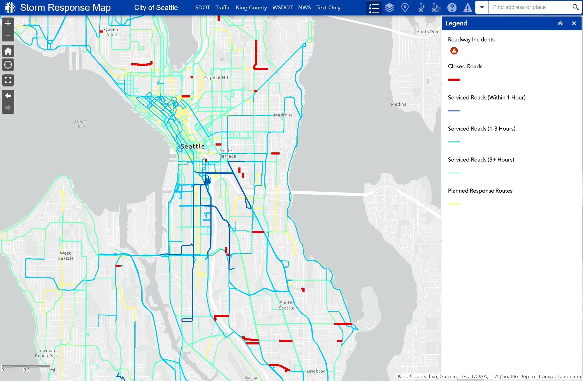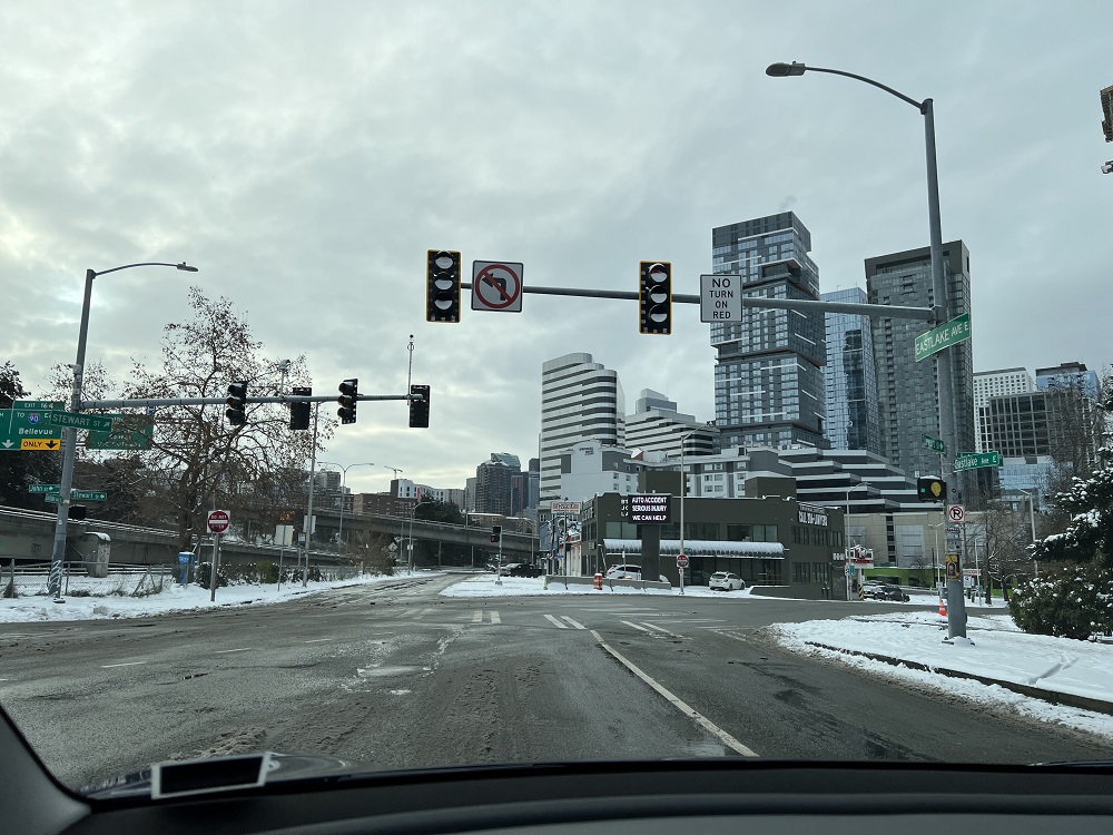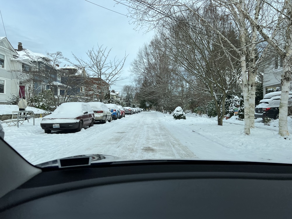 The City of Seattle provides this handy map of the roads that had been plowed. The reds are streets with steep grades— big trouble if they have snow and ice on.Here’s the Eastlake Ave & Stewart St intersection. ‘NO TURN ON RED’ .. but is it red? The traffic light scones are all clogged with snow, and one can barely make them out. This could be trouble for Tesla’s ‘Full Self-driving’ mode: an edge case, as it is called. I would think the car would come to a stop, when the cameras cannot make out the color of the signal (assuming they would recognize the boom & light fixtures as a traffic light).This is 18th Avenue. Not a problem to drive on, as long as one goes nice and slow. The brakes can do only so much to stop the vehicle on a slippery surface. (Yes, my Model 3 has anti-lock brakes, but I have no intention of testing them out, if I can help it).