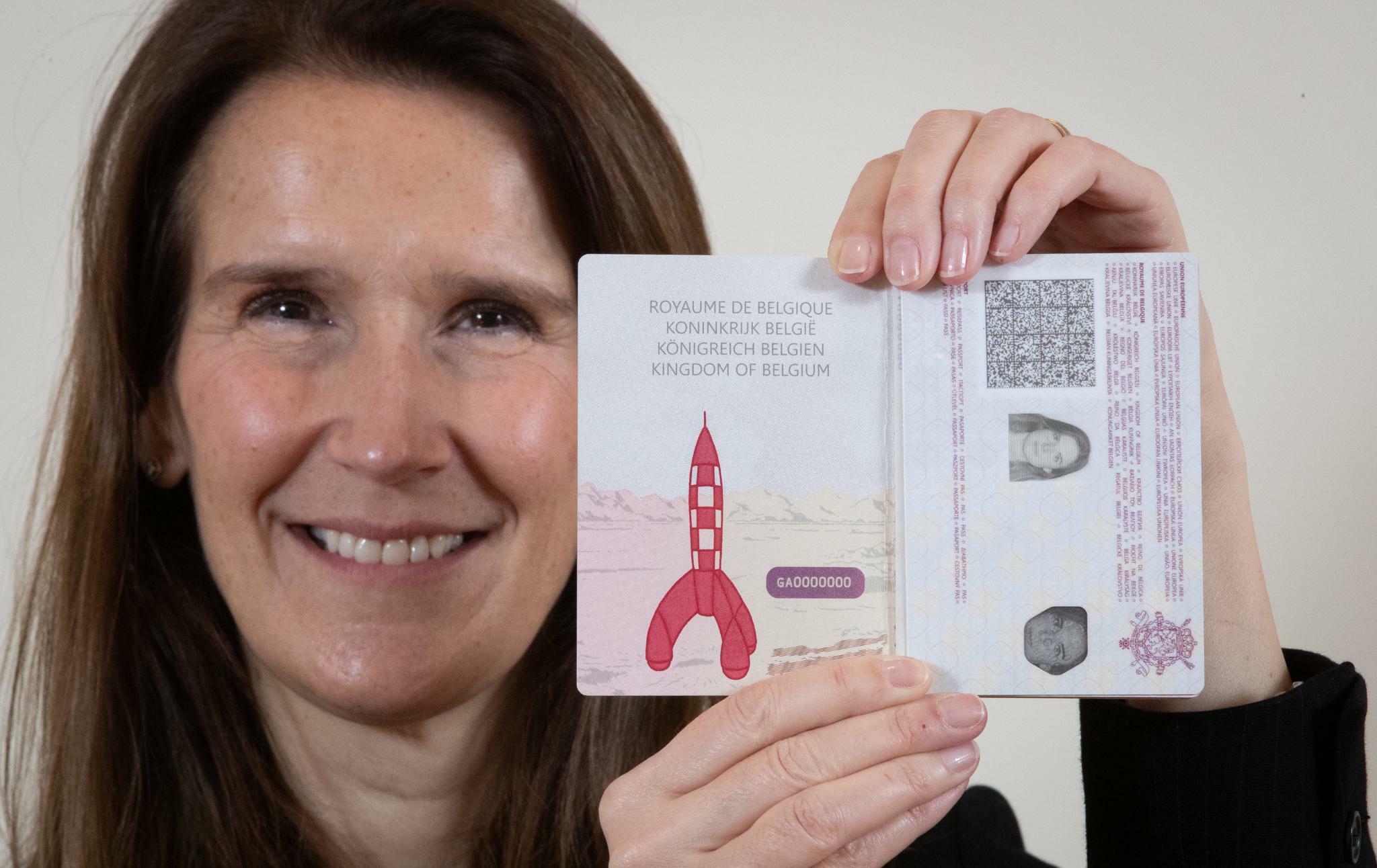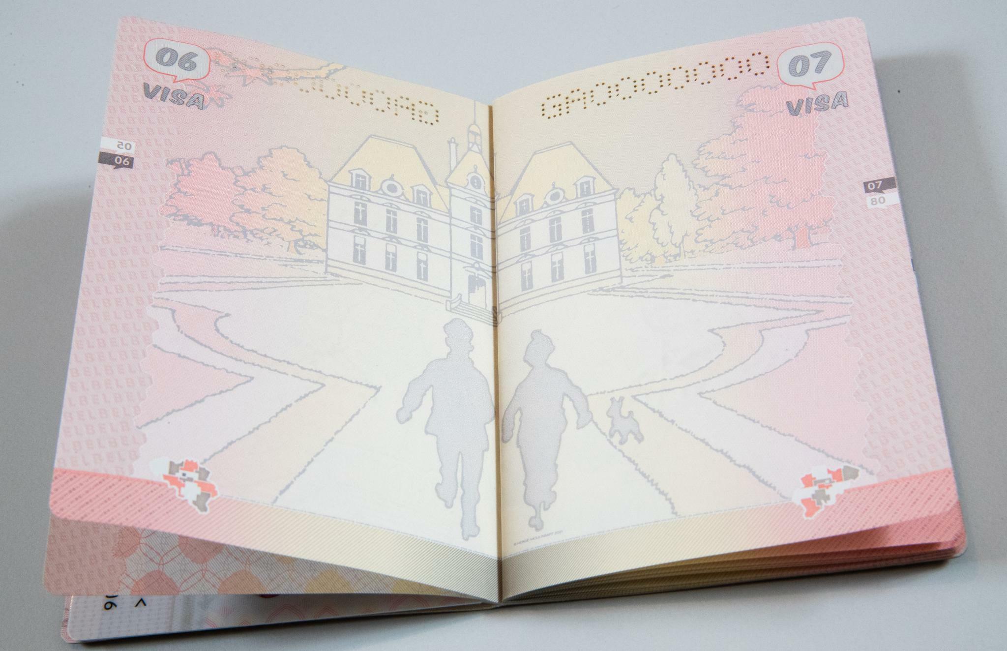 A passport ready for space travel? Sophie Wilmes, Belgian Foreign Minister, shows the new Belgian international passport with its drawing of the rocket from the Tintin adventures Objectif Lune (‘Destination Moon’, first published 1953) and On a Marché Sur la Lune (‘Explorers on the Moon’, 1954). [Photo: Benoit Doppagne/ DPA]Visa pages in the new Belgian passport with a background drawing by Hergé, from Les Sept Boules de Cristal (‘The Seven Crystal Balls’, 1948). The figures walking towards the chateau are Captain Haddock, Tintin and Snowy. [Photo: DPA]
