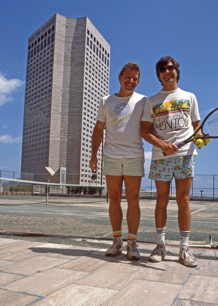This between-the-legs shot (also called a ‘tweener’) from Alcaraz came early in the match against Tsitsipas On Tuesday, at 1-1. Alcaraz had to run back to retrieve a lob from Tsitsipas, and there was no time to turn around. It won Alcaraz the point. [Still image from streaming service Tennis TV]March 1990. My brother Chris and I, before hitting a few balls on the green clay court of the Miami Intercontinental hotel on the third floor. We were there to see our brother Piet play in the Miami Open for real (he was a professional tennis player). At that time it was only the 6th year that the tournament was held. It was billed as the 1990 Lipton International Players Championships.