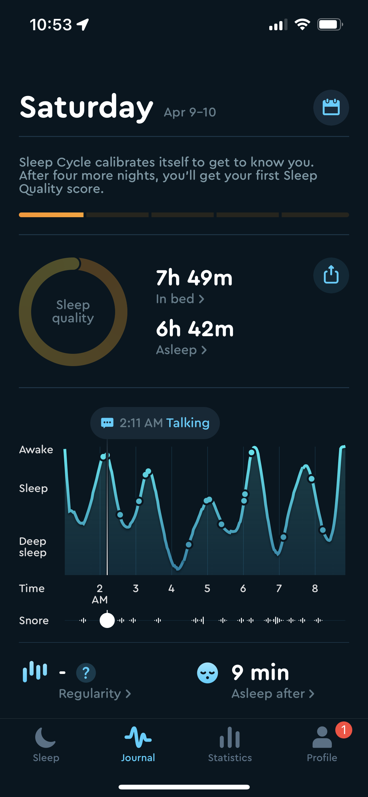 For comparison with the Apple Health app, I’m trying an app called Sleep Cycle (screen shot on the right). The results from last night look encouraging (more accurate).