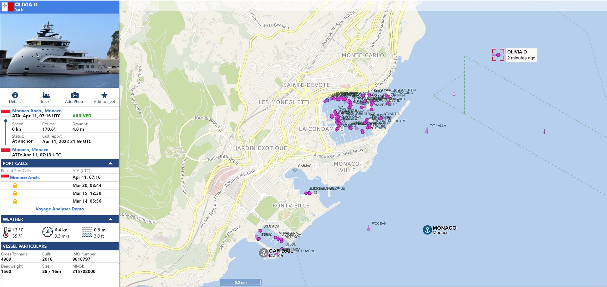 A few clicks on the icons on marinetraffic.com floating around Monaco revealed it to be the Olivia O. She is owned by Eyal Ofer (age 72), Israeli billionaire based in Monaco (of course), and active in shipping and real estate. Price tag: $200 million, with an estimated running cost of $15-20 million per year. The vessel has 7 cabins for guests and 15 cabins for the crew (not nearly as luxe as the ones for guests, I am sure).